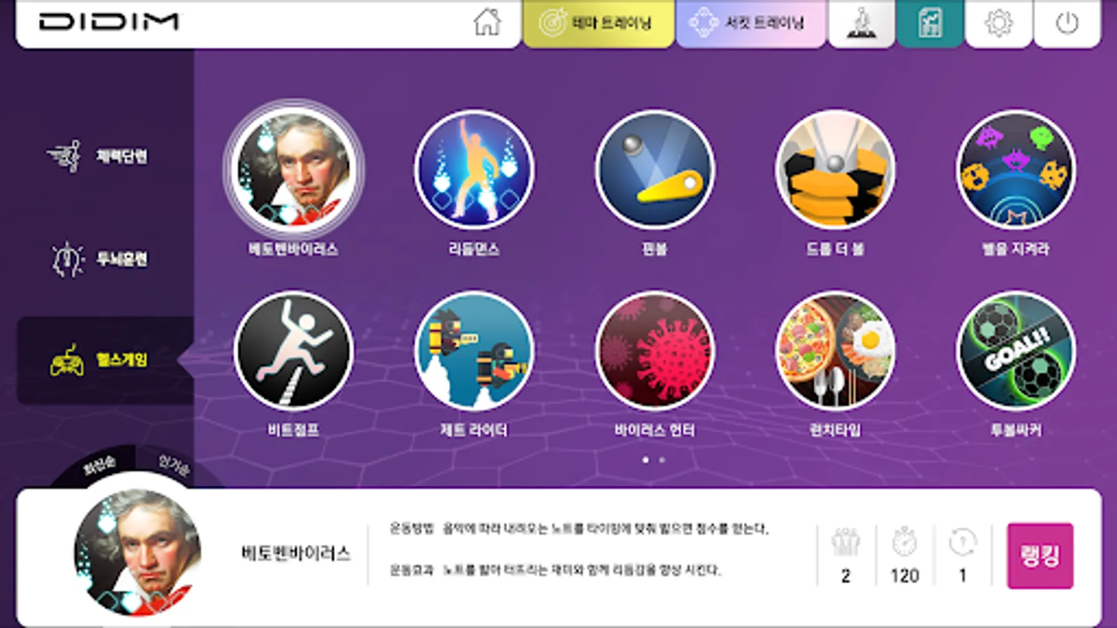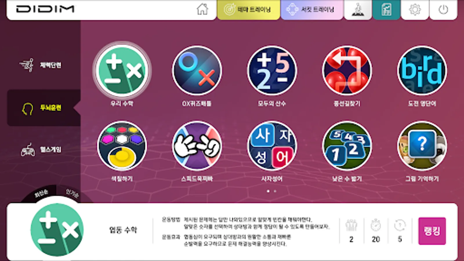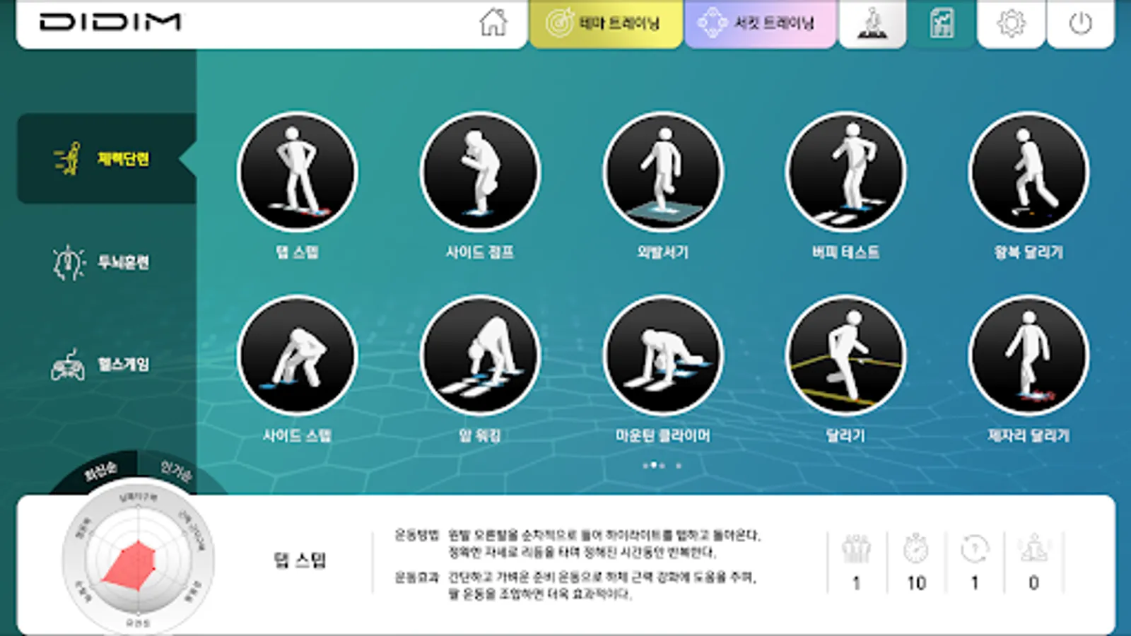 Didim is an indoor exercise platform implemented with augmented reality (AR). It was developed to be played on the floor instead of the wall by using a non-contact lidar sensor, and only with the body without any tools. It consists of simple but highly addictive exercise and play contents in three categories of strength training/brain training/health game.