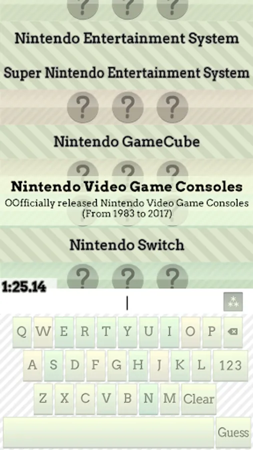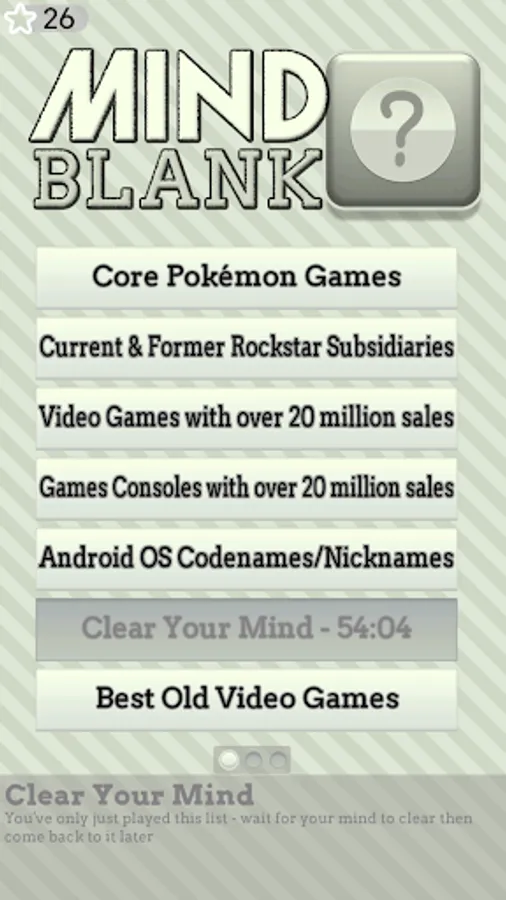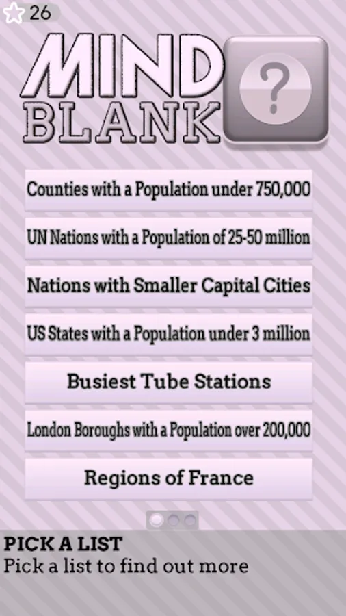 With 98 lists over 4 categories to choose from, pick a list and try and name as many items in the list as you can - from countries to TV characters, from hit games to big countries, you'll surely find a list you THINK you can complete, but when it's there in front of you and the clock is ticking, try not to get a mind blank!