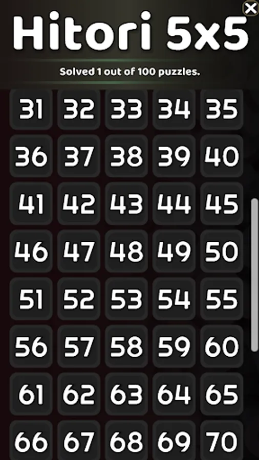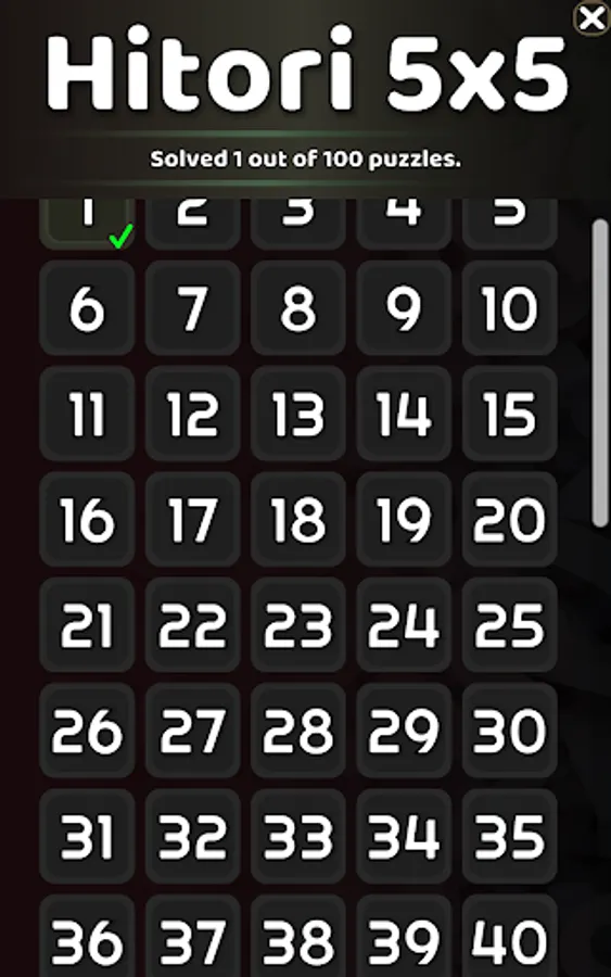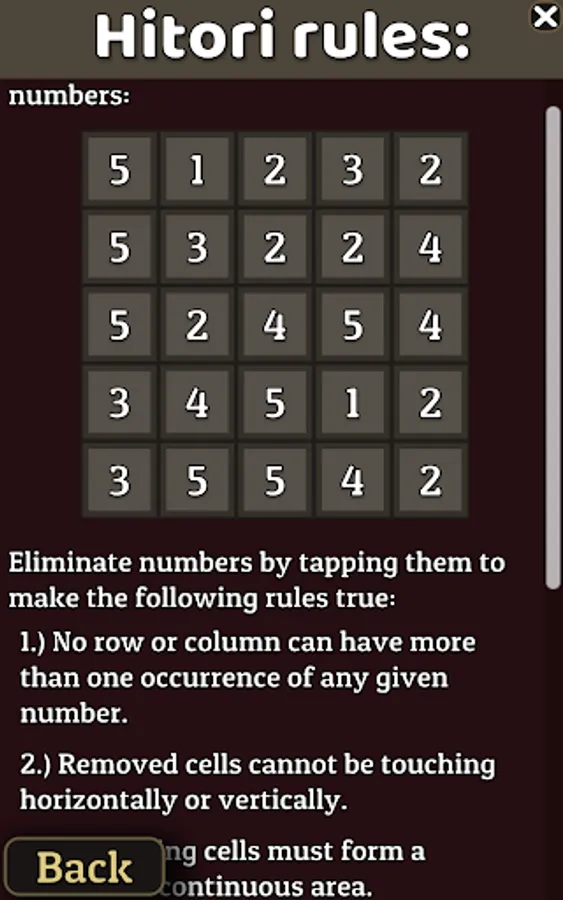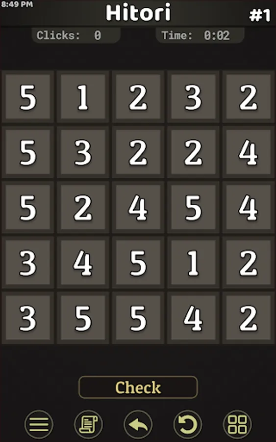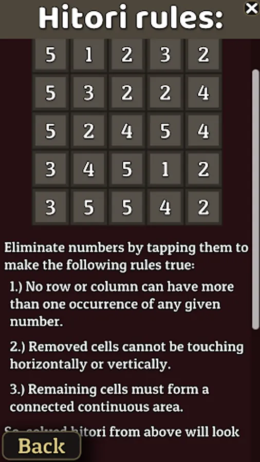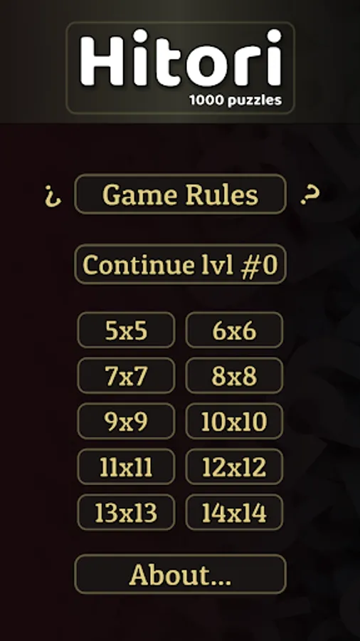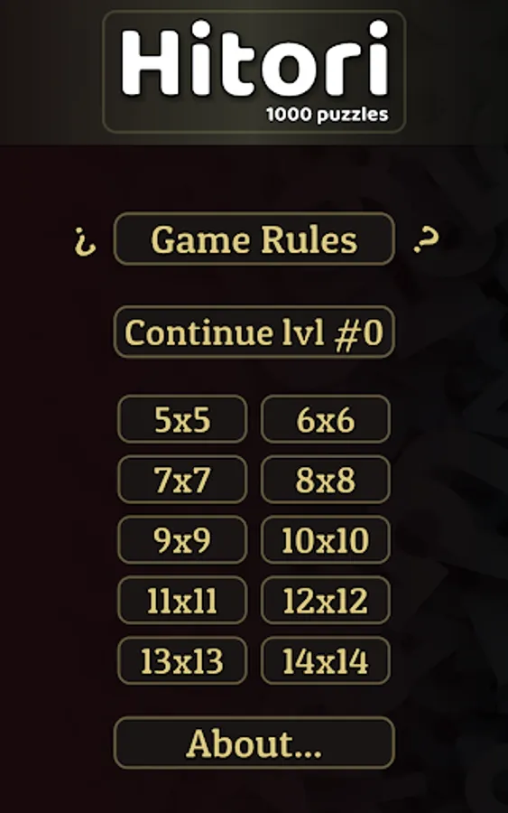 Hitori is a game about numbers. It is a logic puzzle. Game contains thousand puzzles of various sizes and mixed difficulty. Sizes of the puzzles are from 5x5 to 14x14.