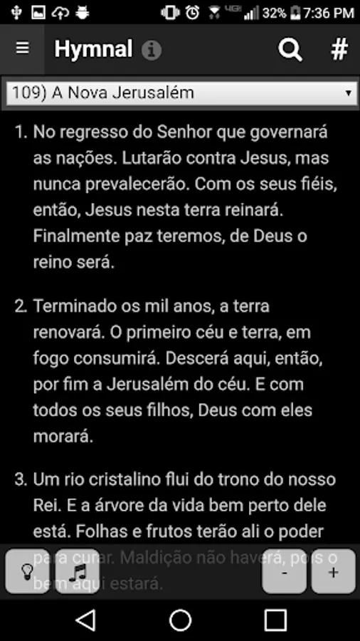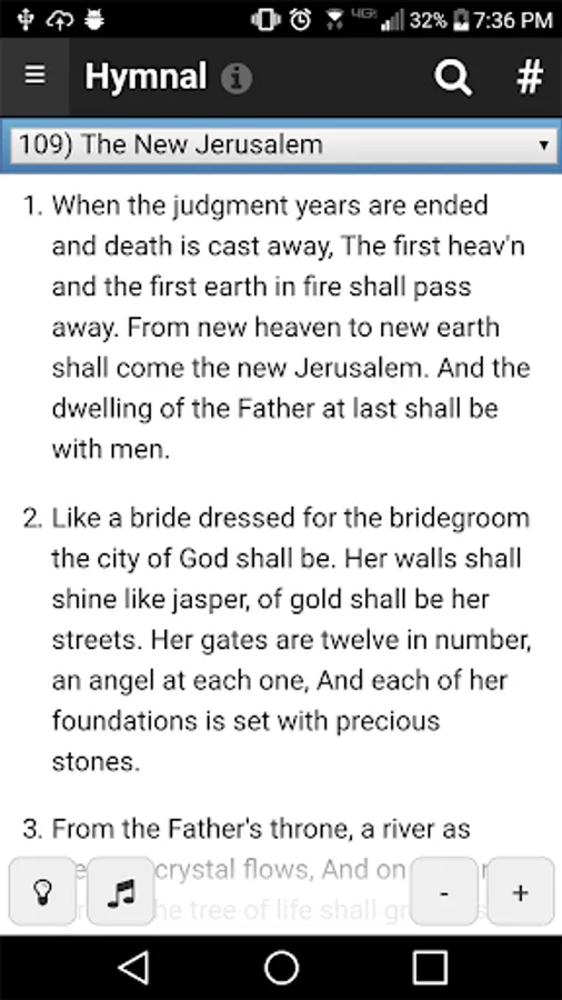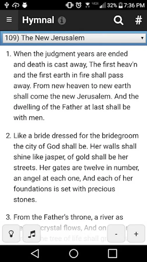 An app version of the United Church of God hymnal with piano mp3's of the hymns. Added a high contrast icon, improved search functionality, along with Spanish, French, German and Portuguese language translations.