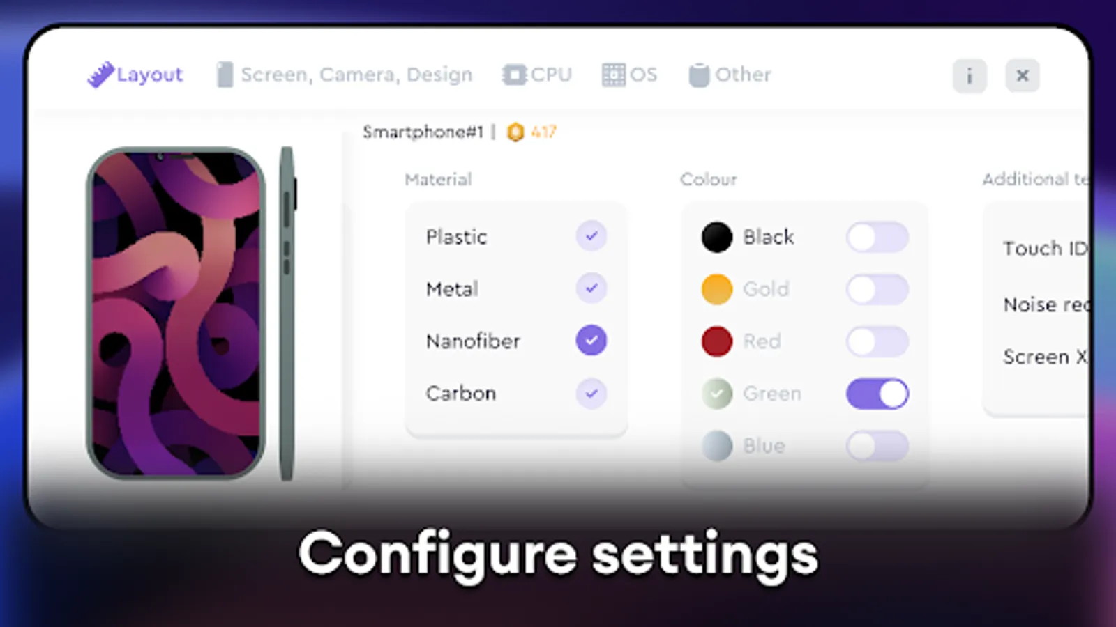 -Smartphones. You can create almost any smartphone in this game. The simulator allows you to adjust