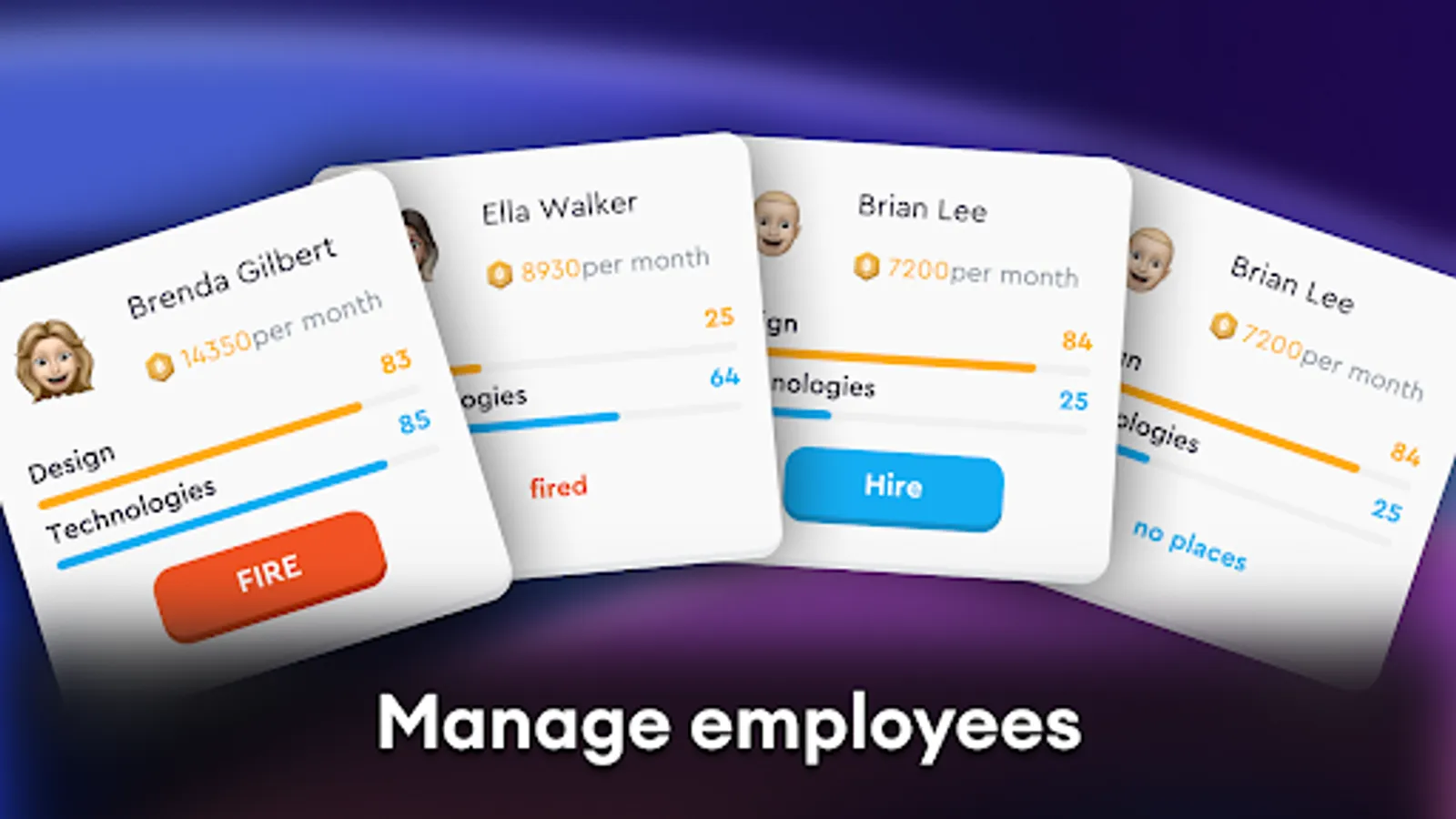 -Workers. The team can hire employees who would develop your company. All candidates have experience in two areas: design and technology. Carefully study their resumes. The more experience an employee has, the higher their salary is.