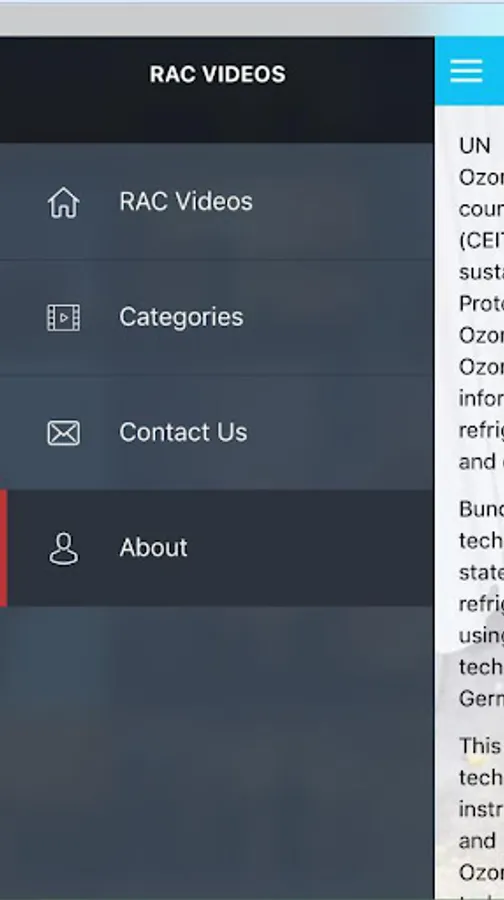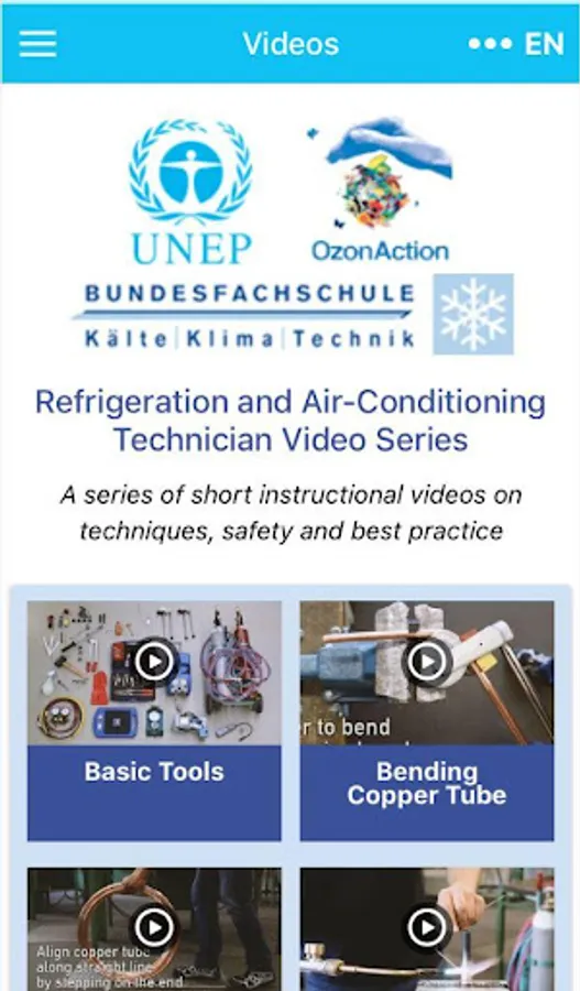 This application, consisting of short instructional videos on techniques, safety and best practice, serves as a complementary training tool for refrigeration and air-conditioning (RAC) sector servicing technicians to help them revise and retain the skills they have acquired during hands-on training. The videos are not intended to replace structured formal technician training, but to supplement and provide some revision of tips and skills and to build on training already undertaken.