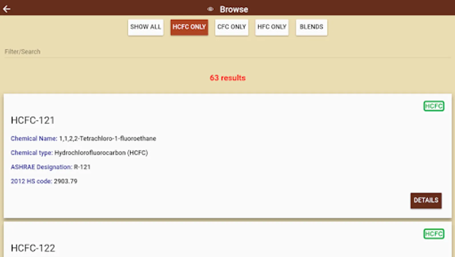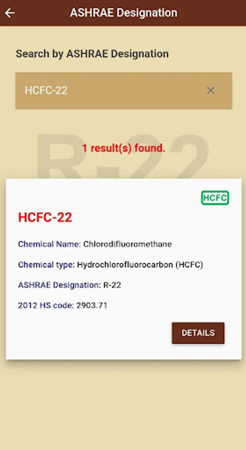 The app is searchable via a variety of methods and provides a wealth of useful information. By entering partial information or browsing the database, the application will provide quick reference information on many aspects of the chemical in question, including: the chemical name and formula; type of chemical, common trade names; various chemical and commodity identifiers (CAS numbers, ASHRAE designations, 2022 HS codes, UN numbers, etc.); as well as other useful information such as flammability and other hazards; the ozone depleting and global warming potentials, and if the chemical is controlled under the Montreal Protocol. The app includes both pure substances and mixtures (blends) and can also be viewed in French and Spanish.