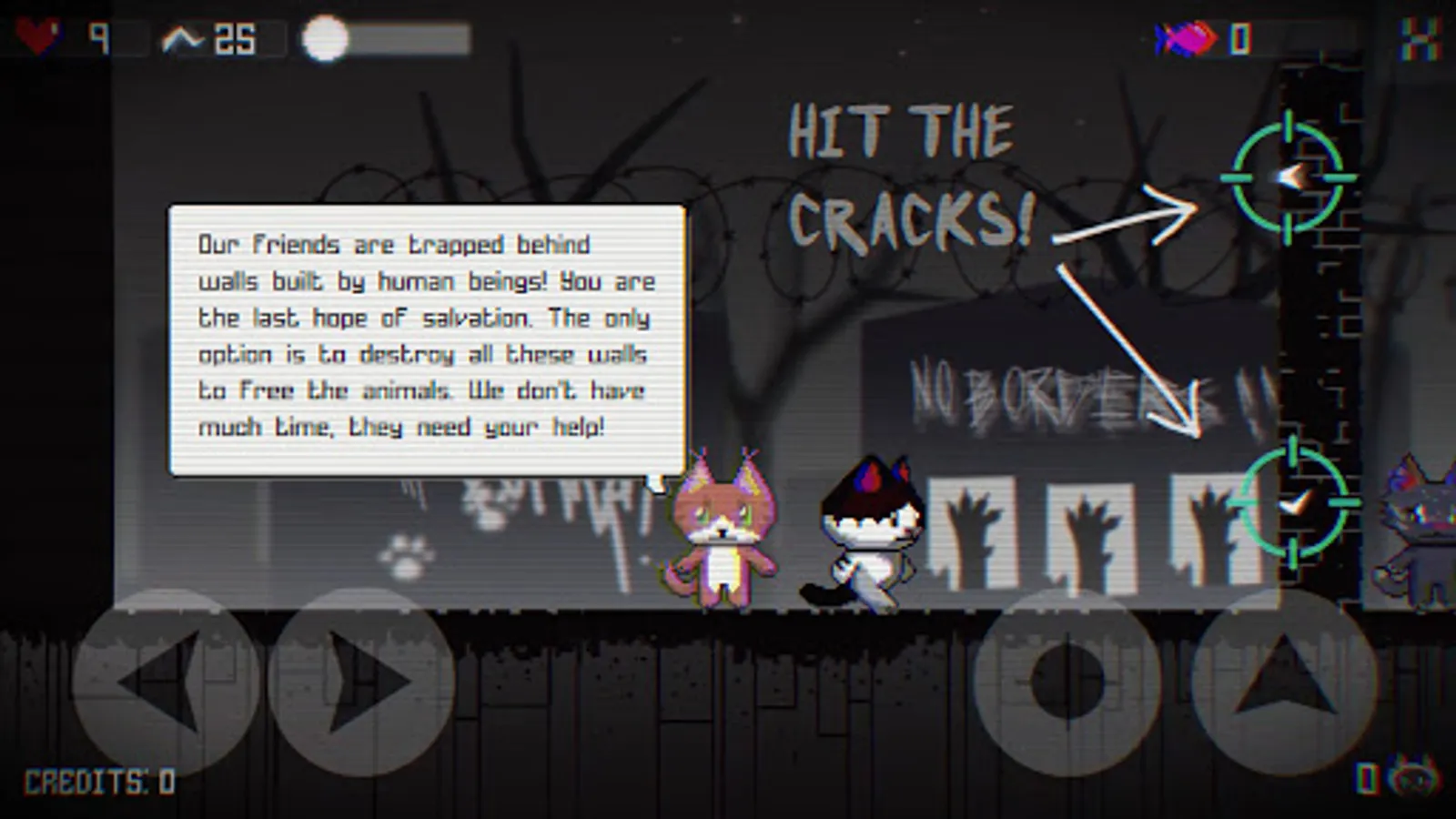 Hero Kitty is a adventure platformer and action arcade game embedded in a dark, falling apart world of boundaries and borders. The nature of this town is rough and full of rebel signs, far from an essence of everyday life. As a player, You have to destroy what is left of the walls, which are dividing the place with your friends, warrior cats, lynxes and others into sad and lonely spots. Player has a powerful ball to throw and bounce to hit the cracks in the walls, which weakens and destroys them. To strike the crack, it requires targeting a suitable spot on the ground for getting the right trajectory. Also the player has to be warefull of the dangerous rubble falling down. As the walls are destroyed, imprisoned creatures are finally free and ready to enter their town with no borders. If you are looking for 2d 8bit platform games, cute games for girls, retro style classic arcade games or just sweet pixel art kitten hero adventures - try Hero Kitty!