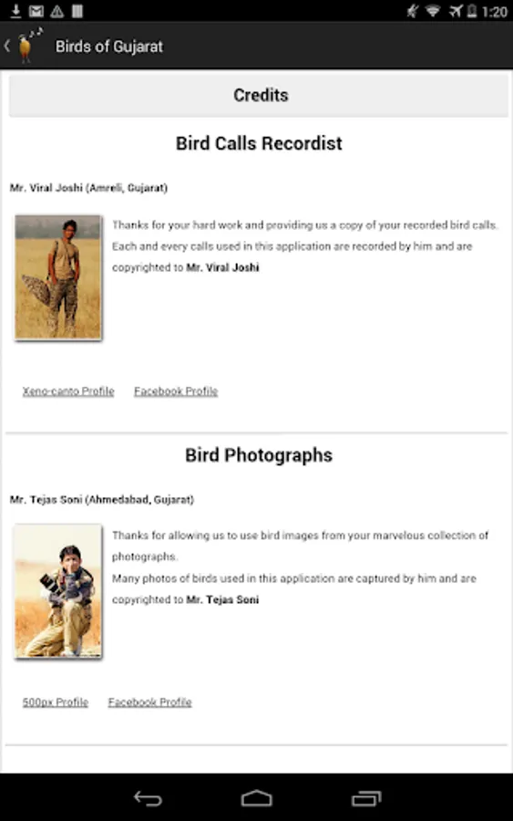This application is free to use, every calls used in this application is copyrighted to Mr. Viral Joshi, description of a bird is extracted from WikiPedia and link for each article is mentioned on every bird's page. We also have added Oriental Bird Club Image links to easily check images of any bird directly from our application. Many bird photographs are provided by Mr. Tejas Soni and they are copyrighted to him.