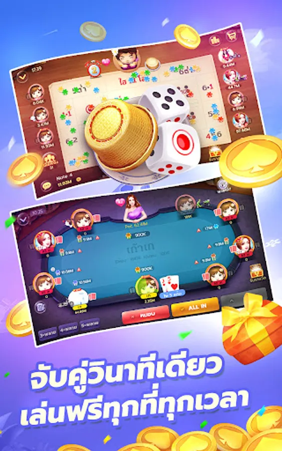 Our play : Dummy, 4K. Pokdeng. Texas etc . Note : This game is for adult players, this game is for entertainment purposes only. Cannot be used to exchange for real money or exchange game chips for real money. Experience and success gained in this game does not imply future success at real money gambling.