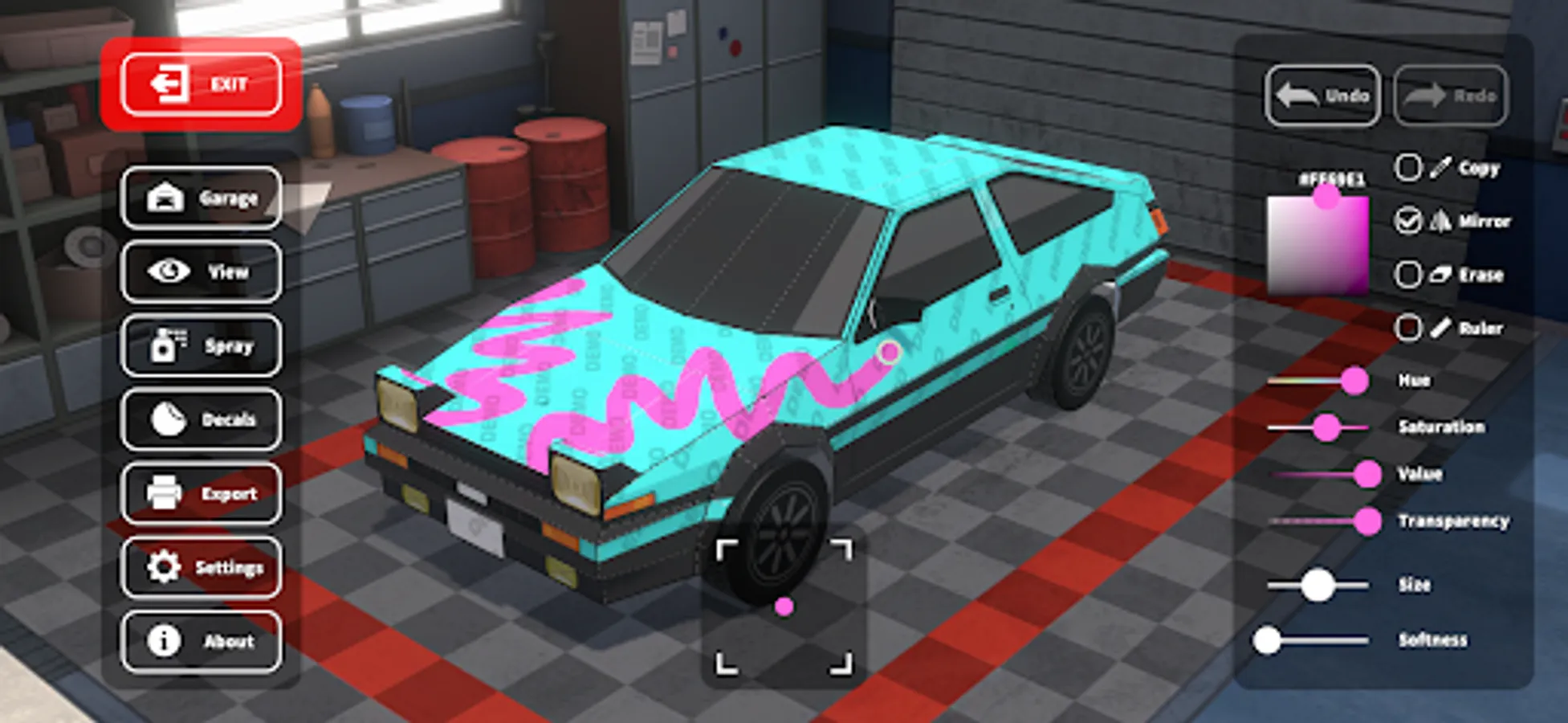 - Spray: freely spray the vehicle through a spray gun. Various tools are available for selecting colors, copying colors, mirroring, erasing colors, and drawing straight lines.