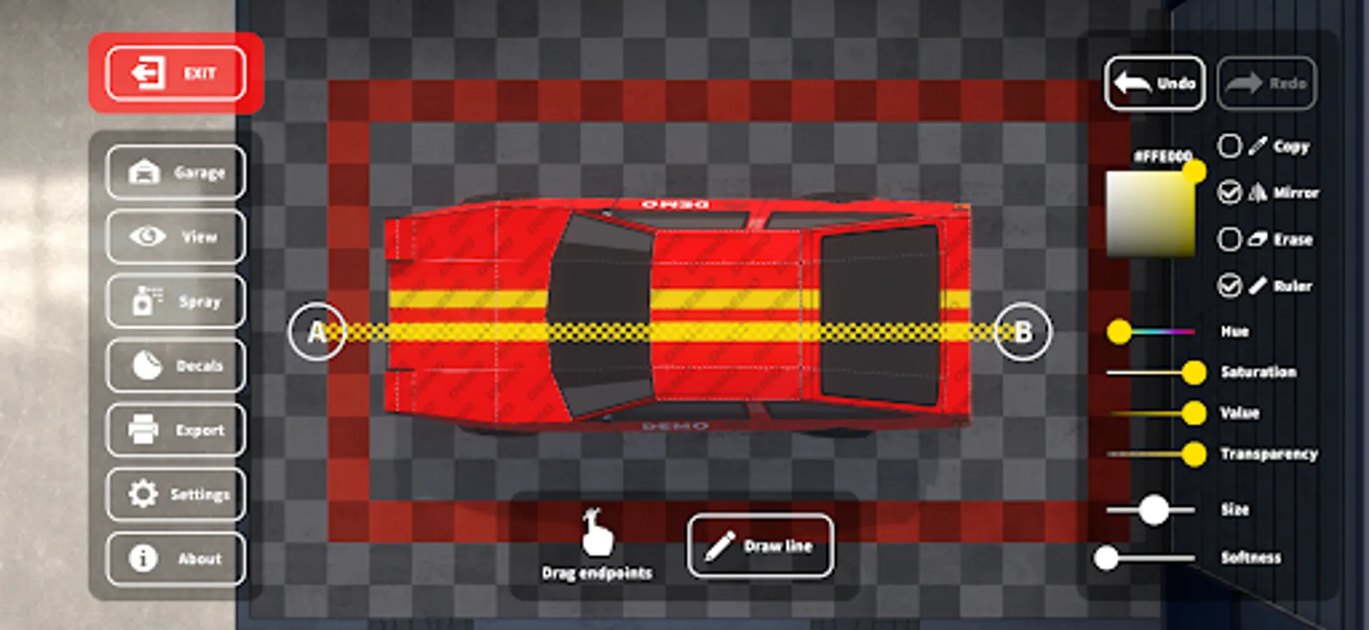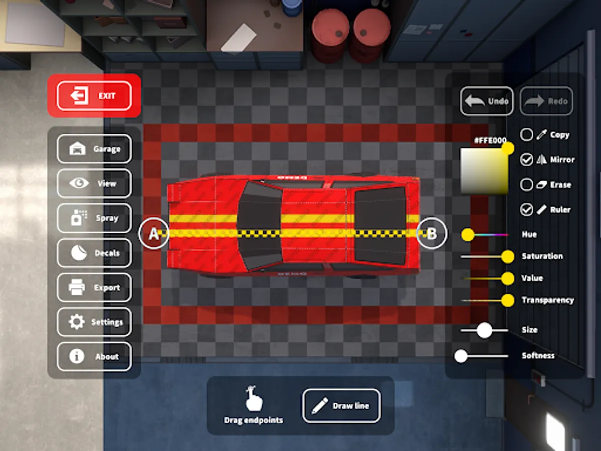 - Decals: apply custom text, album photos, numbers, and national or regional flags to the car body. Various tools are available for changing decal color, copying color, mirroring, and erasing decals.