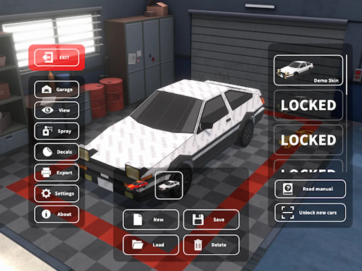 - Garage: scan collectible cards to unlock new car models; read online assembly manuals for the unlocked models; use the paint job manager to create, save, load, or delete paint jobs.