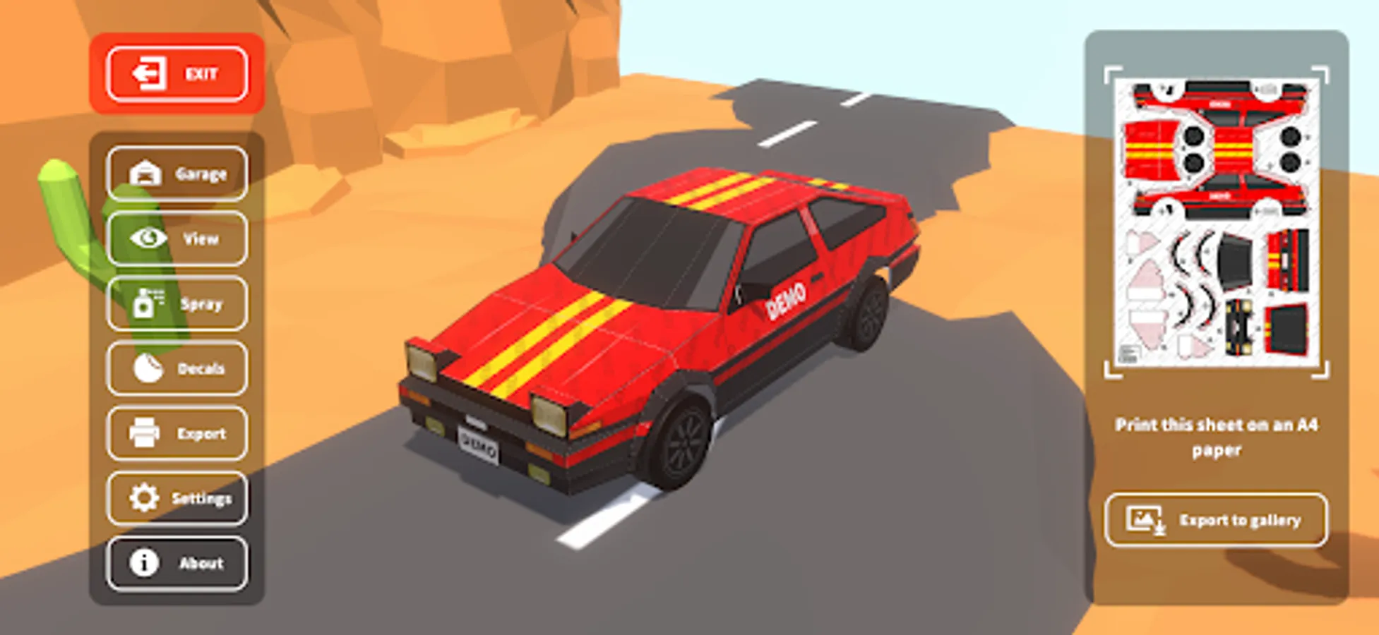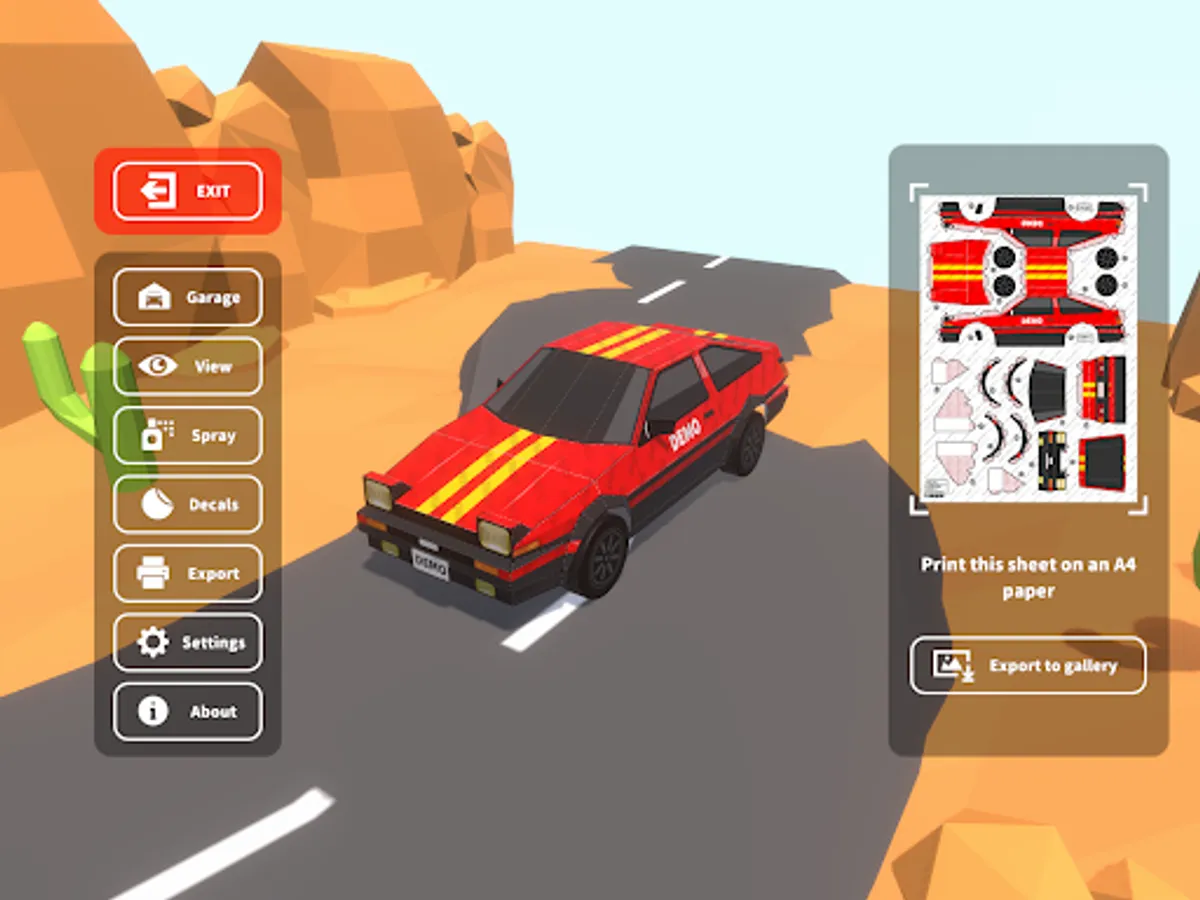 - Export: convert your 3D paint job into an unfolded component sheet and export it to the device album. You can print it on an A4 size paper to build a 3D papercraft car body.
