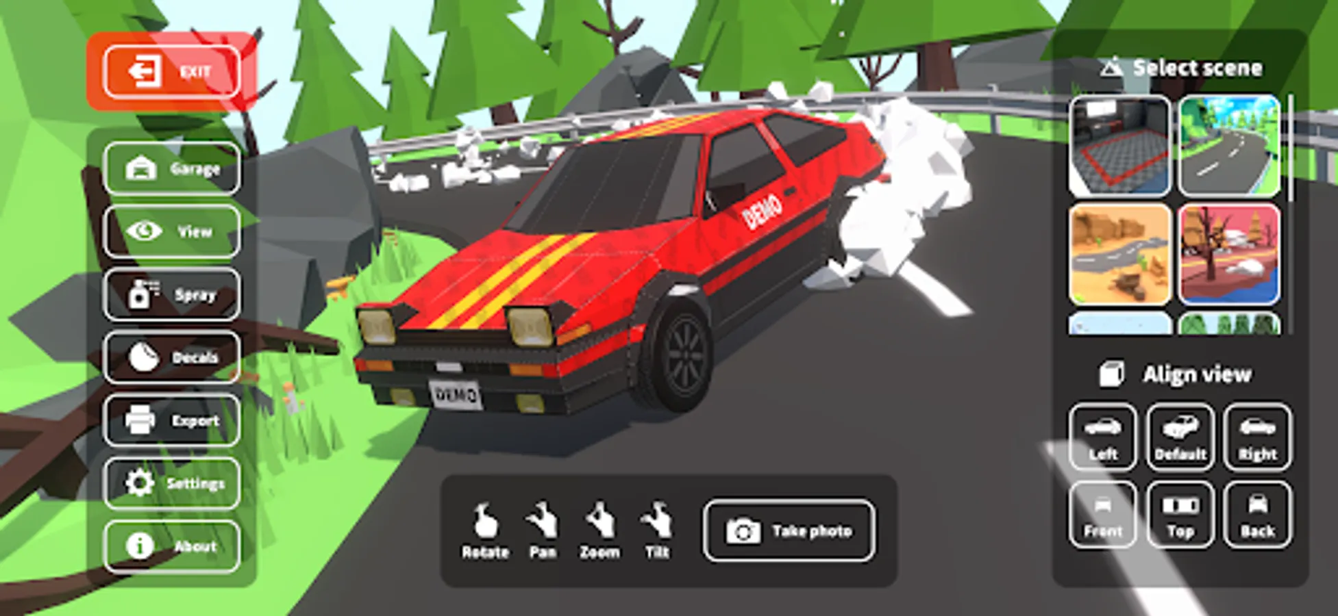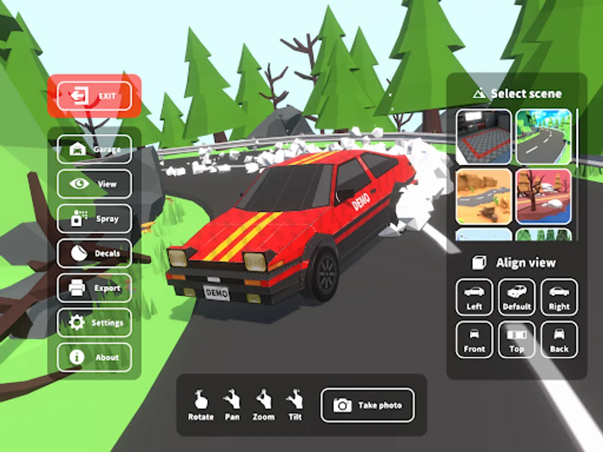 - View: preview your paint jobs and take screenshots in 8 different 3D scenes. Custom photo or camera image can be used as background.