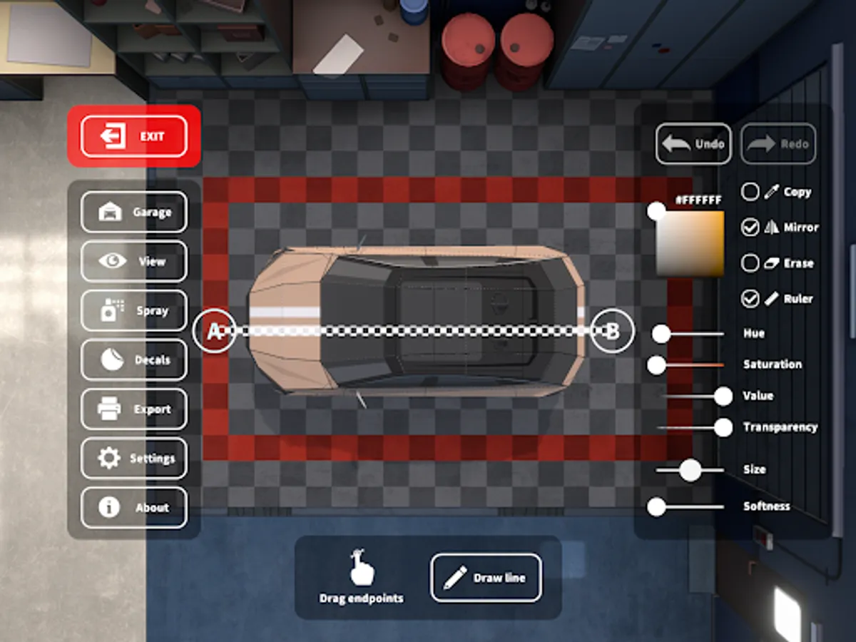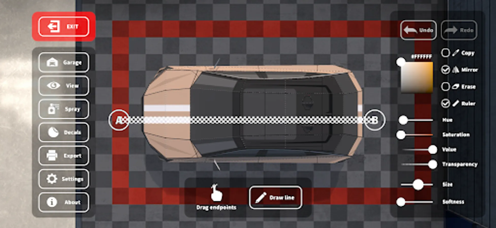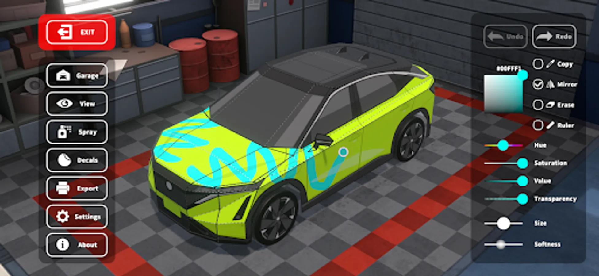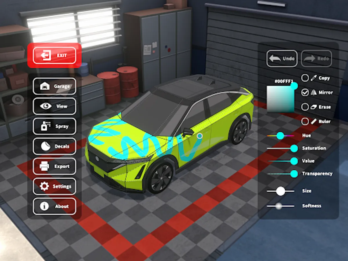 - Decals: apply custom text, album photos, numbers, and national or regional flags to the car body. Various tools are available for changing decal color, copying color, mirroring, and erasing decals.