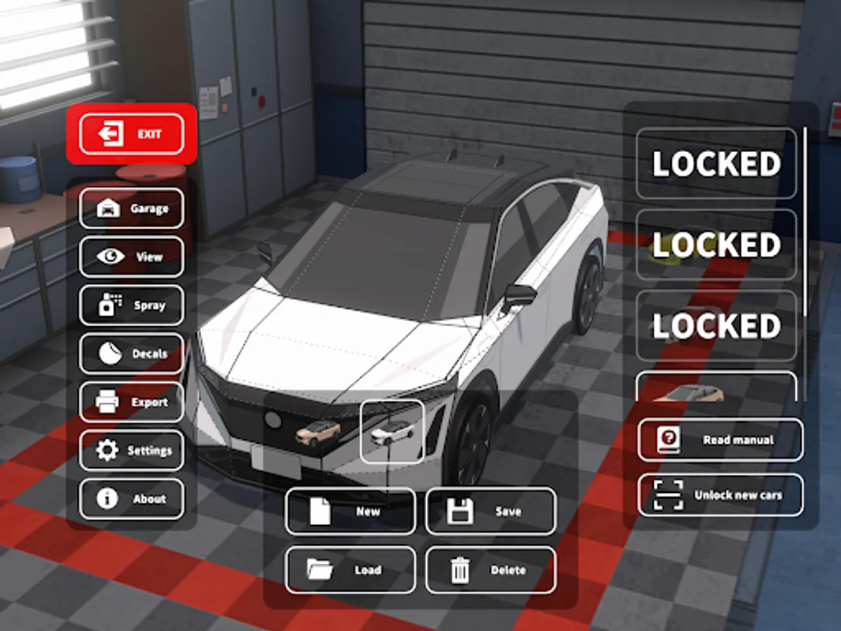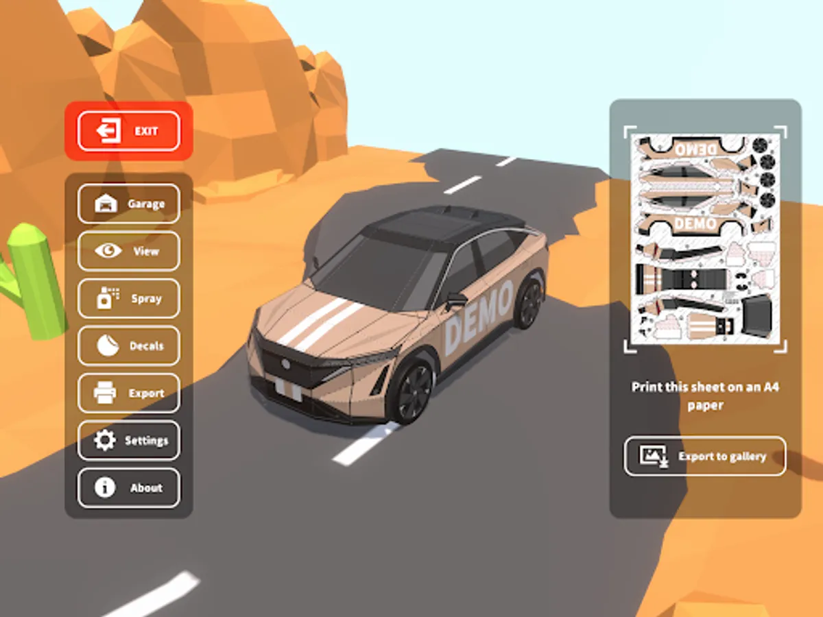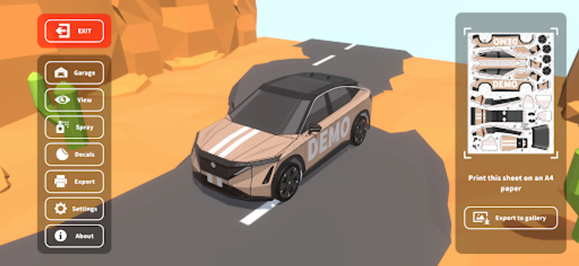 - Export: convert your 3D paint job into an unfolded component sheet and export it to the device album. You can print it on an A4 size paper to build a 3D papercraft car body.