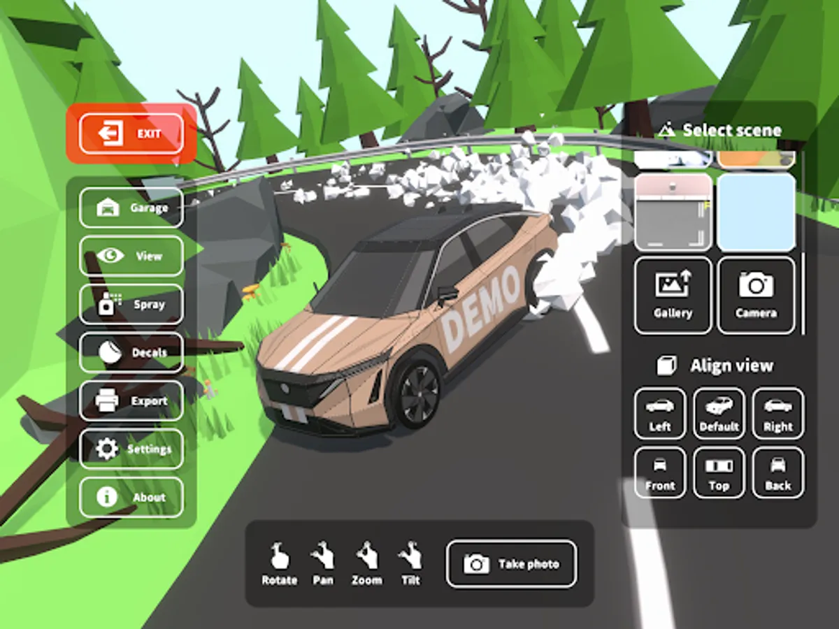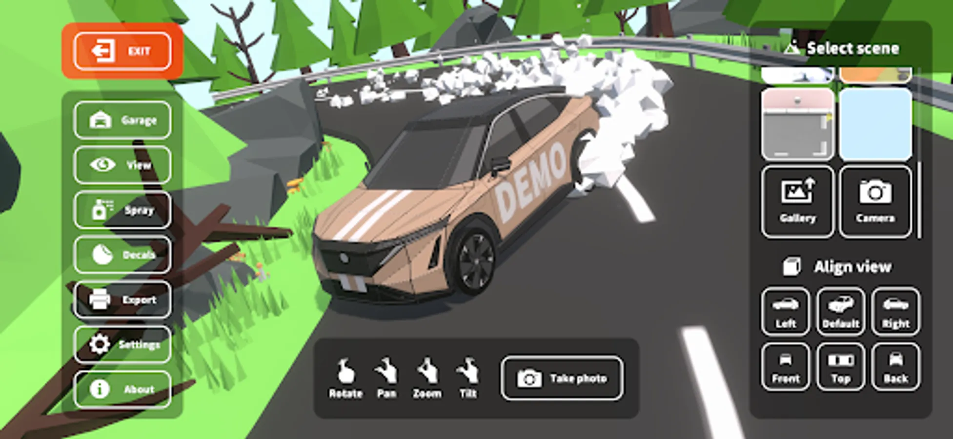 - View: preview your paint jobs and take screenshots in 8 different 3D scenes. Custom photo or camera image can be used as background.