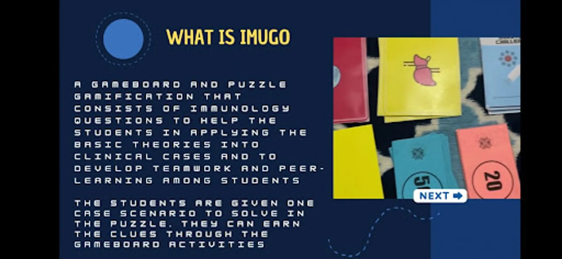 Applying the basic theories in clinical practice always been challenging for many medical/biological courses including Immunology. Lack of student engagement during class implicates the student’s achievement. The situation highlights the critical need for implementation of new instructional design in order to stimulate student participation in learning the theory courses. It is of importance to maintain student engagement during class especially in the midst of online teaching era. Nowadays, the students find game-based learning is more enthralling than conventional projector lecture and books. Therefore, gamification is selected as an alternative tool of learning Immunology. iMUgo MindHack is a game-based learning tool that incorporates augmented reality (AR) element aims to stimulate the student’s ability to apply knowledge related to Immunology in given clinical presentations/practices. iMUgo MindHack promotes engagement in learning as the students are motivated with point award and peer assessment systems. This game will be played by a group of 4 students and each of the successful mission that they carry out individually will help them to win the puzzle piece and solve the puzzle which contains the final answer for the entire game. The money that the student earn throughout the activity will be translated into continuous assessment mark.