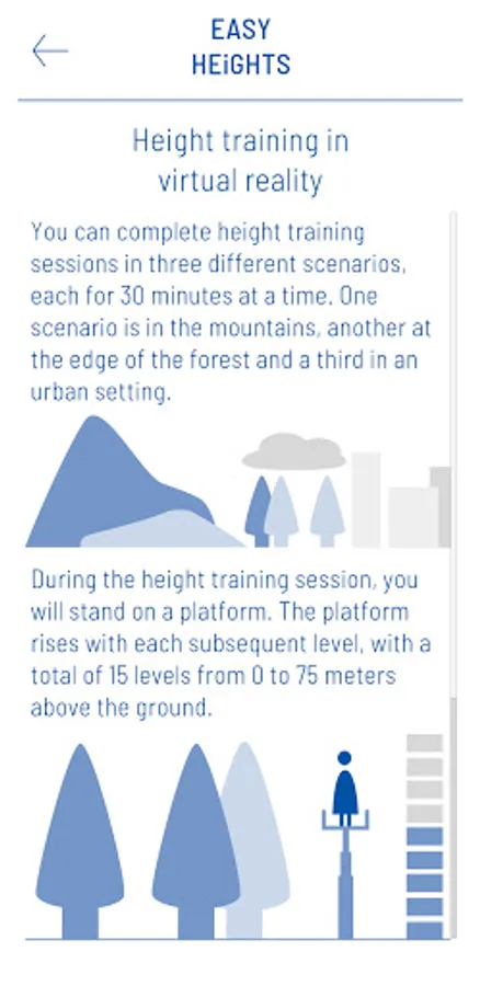 EASYHEiGHTS offers three scenarios (mountain landscape, forest edge, urban surroundings), providing the opportunity to become comfortable in height situations. In all three situations, the user stands on a platform that rises only when their fear at the current level allows. Each scenario has 15 levels. Initially, the platform moves up 1 meter to the next level. In the advanced levels, the height increases several meters at a time. At the final level, the platform is 75 meters above the ground.
