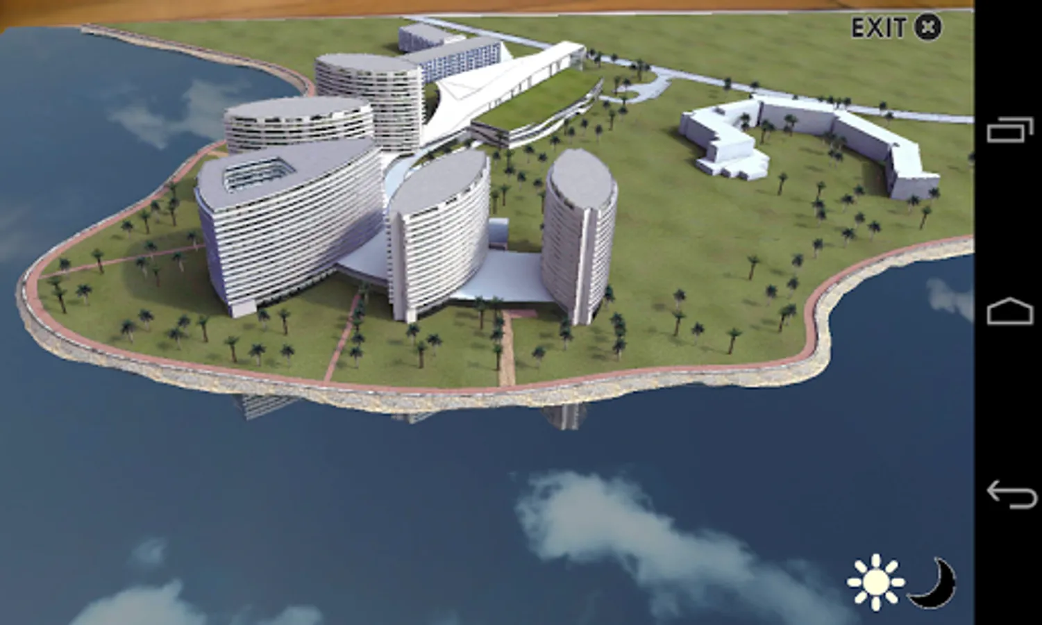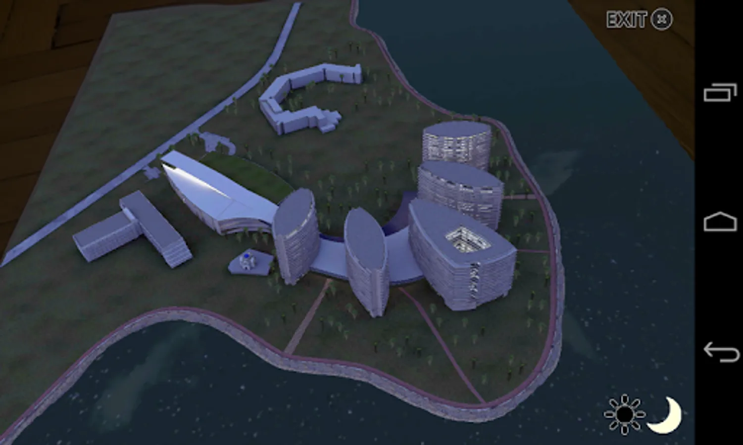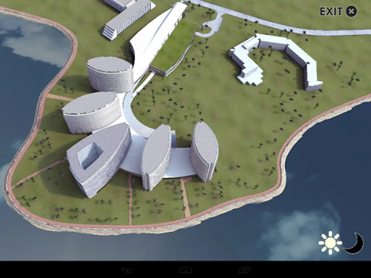 Through this Augmented Reality app, the public are also able to see the complex. With the sun/moon icon on the right bottom corner you can change between daylight and nighttime environment.