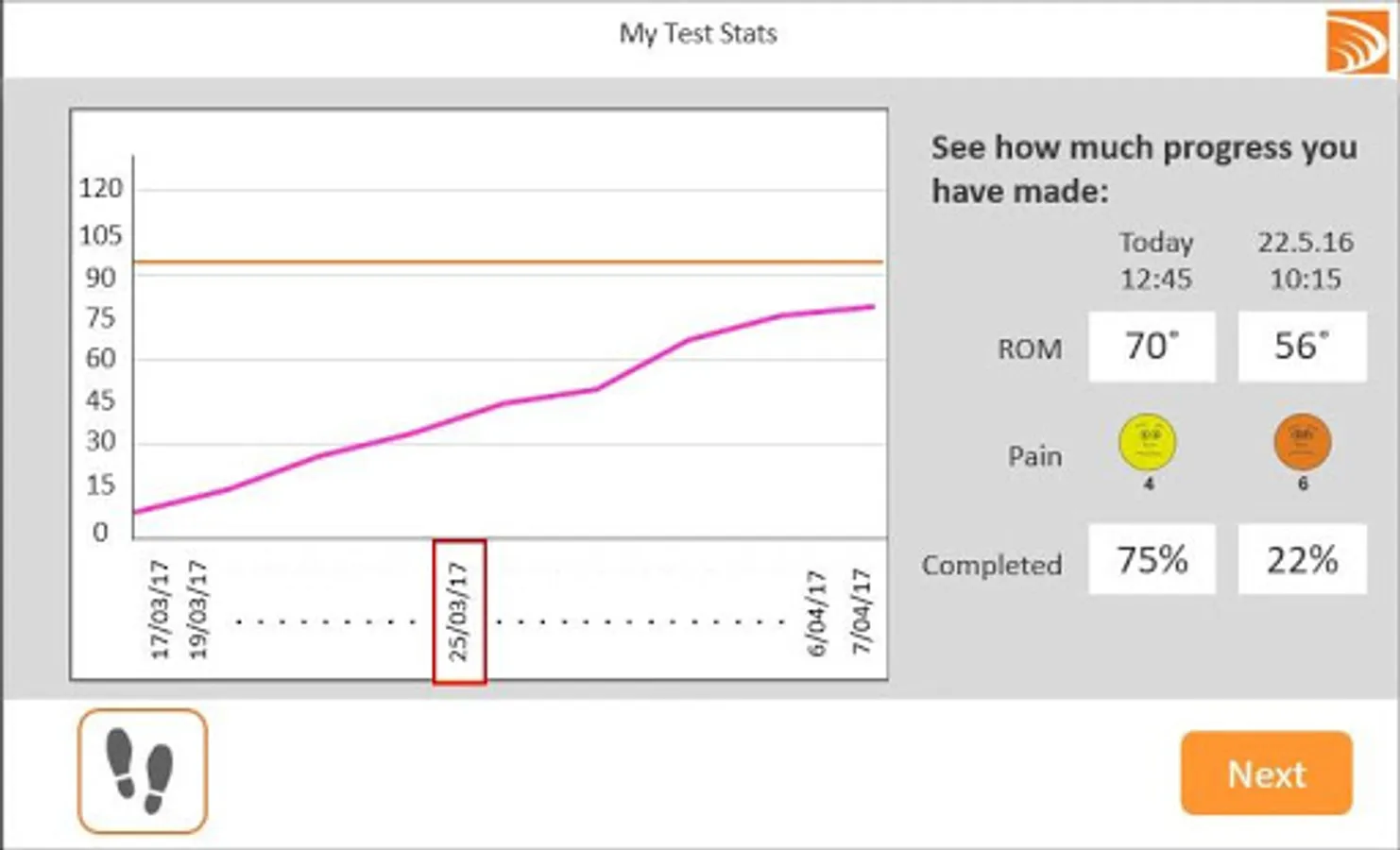 Your daily test programme will be a combination of tests to assess your range of motion and physiotherapy exercise videos to help with your rehabilitation. You will probably be asked to do your routine three times each day. During your programme, you attach your sensor as shown by the software, which then transmits your movement results to your tablet. After your daily tests, you can review your progress and see how many steps you have taken since you started using the sensor.