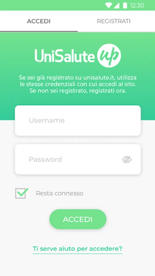 To access the functions of the UniSalute app, enter the username and password you already use to enter your reserved area of unisalute.it. If you are not registered yet, you can also register on the app.
