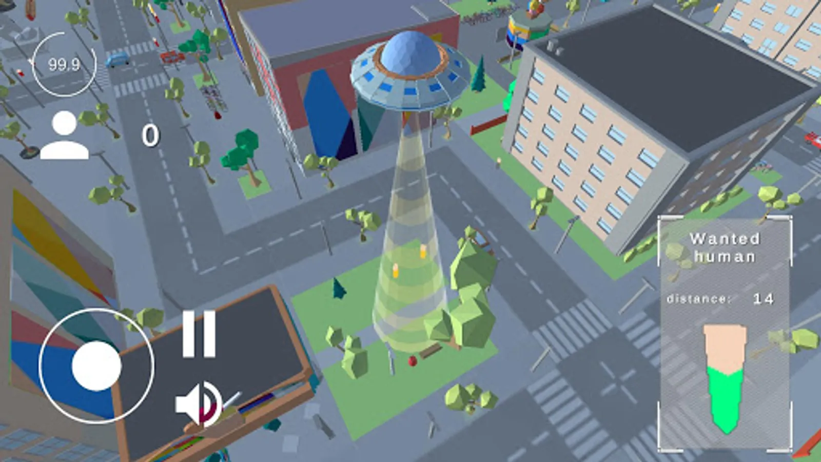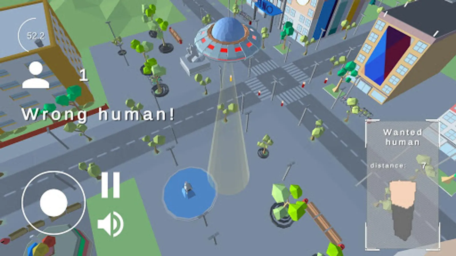 Steer your UFO over the city and abduct the wanted person. But make sure you beam up the right person. Can he escape you?