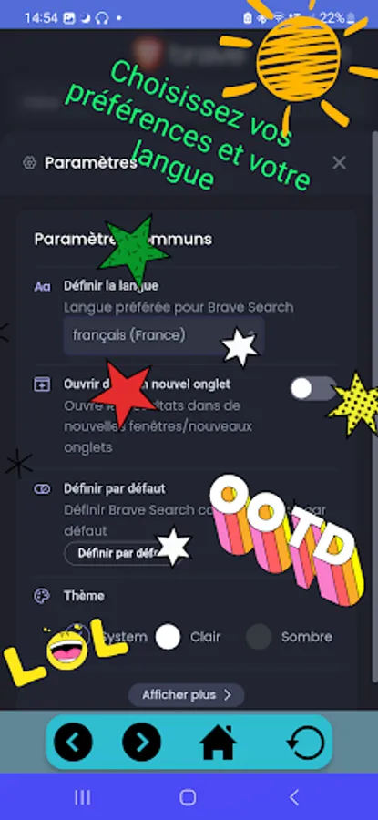 FRATHECH and BRAVE united is against all that such as ads, cookies, phishing, blocking all tracking systems by default and storing your data to resell them, thanks to Universo navigate without any worries, without any cookies on your back. To change the language, go to settings and language.