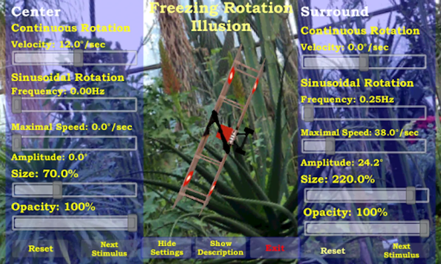 (i) A percept of motionless center (“freezing rotation illusion”) arises when the average angular velocity of the surround is fixed to a much higher value than that of the center, and the appropriate oscillation frequency is set.