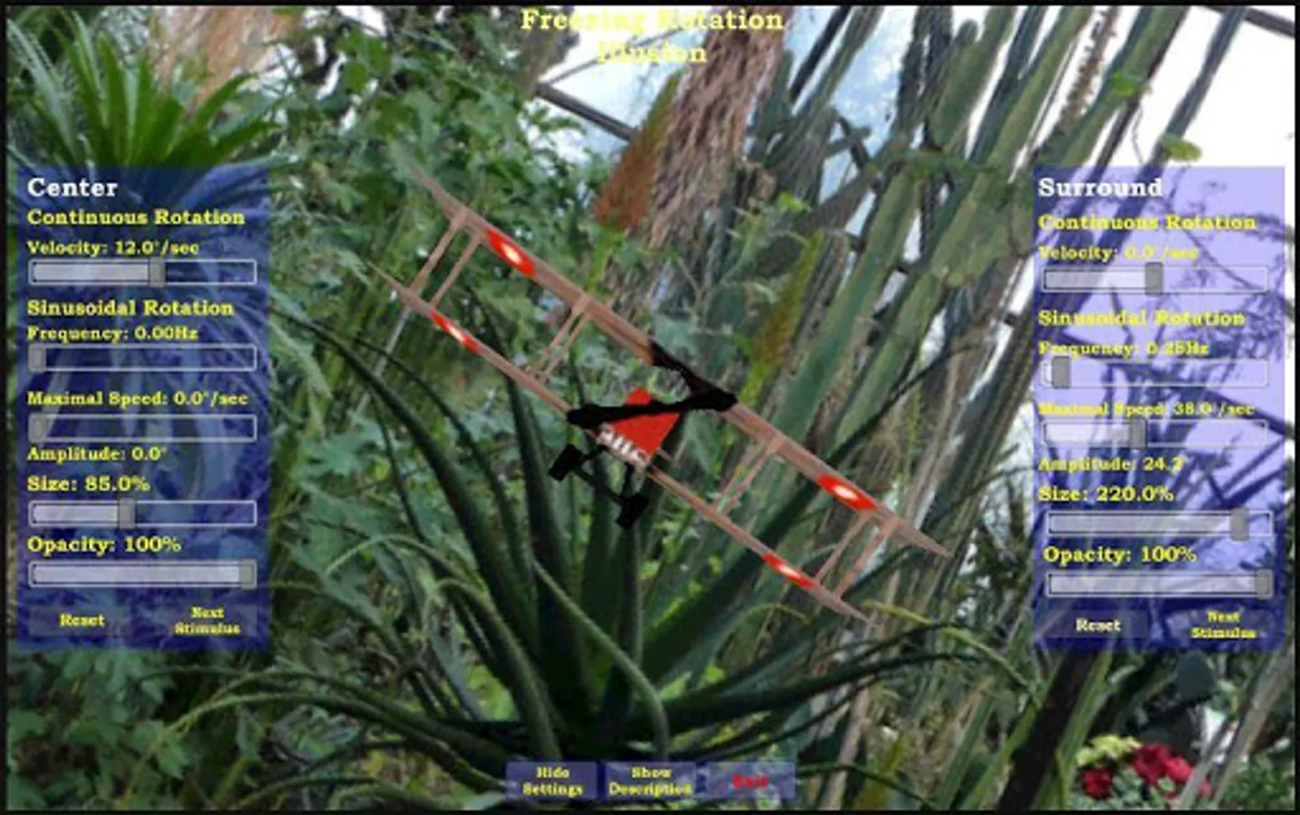 A continuously rotating central texture (center) is presented together with a patterned surround oscillating back-and-forth. Generally, rotation of the surround induces misperceptions of the center’s angular velocity, which are known as “induced rotational motion”: a physically rotating center is perceived as turning faster, when counter-rotating with its surround, and turning slower when co-rotating. However during co-rotation additional velocity misperceptions are observed: