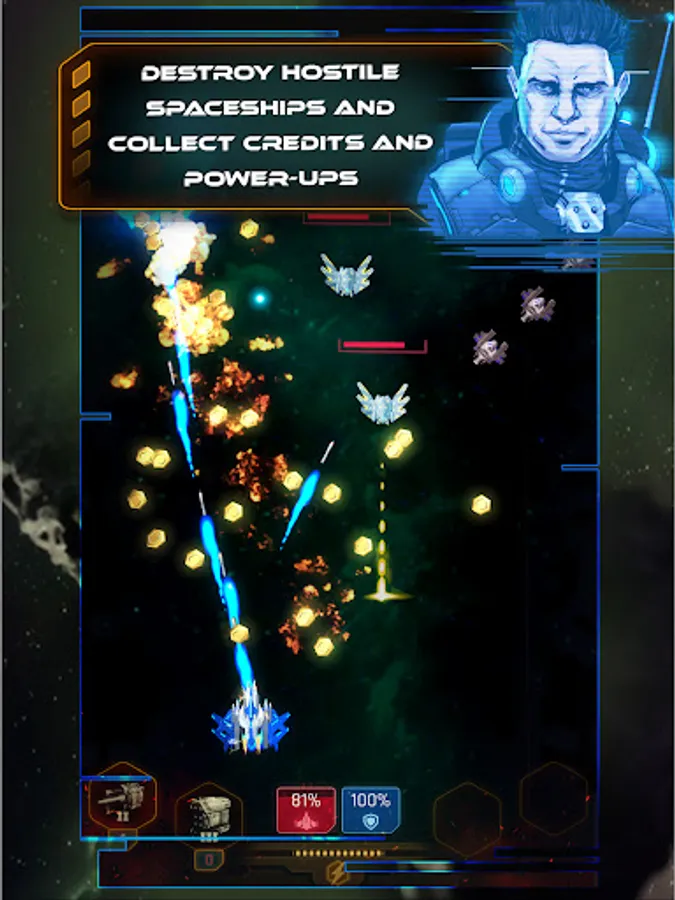 In this Vertical Shooter you will encounter a lot of enemies. Their spaceships are upgraded and the squadrons are ready to stop you on your mission. Beware of the projectiles and rockets β your protective shields won't last forever!