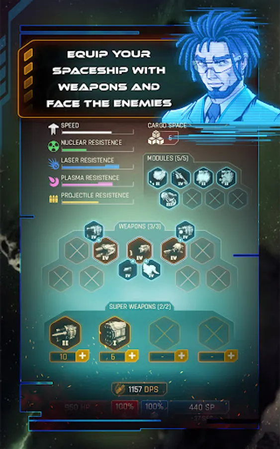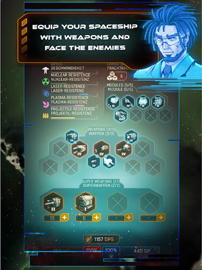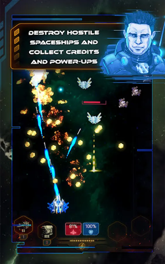 In case you're facing superior enemies, you can employ evasive maneuvers. When you get hit by the enemy, you can have your spaceship repaired in the Hangar.