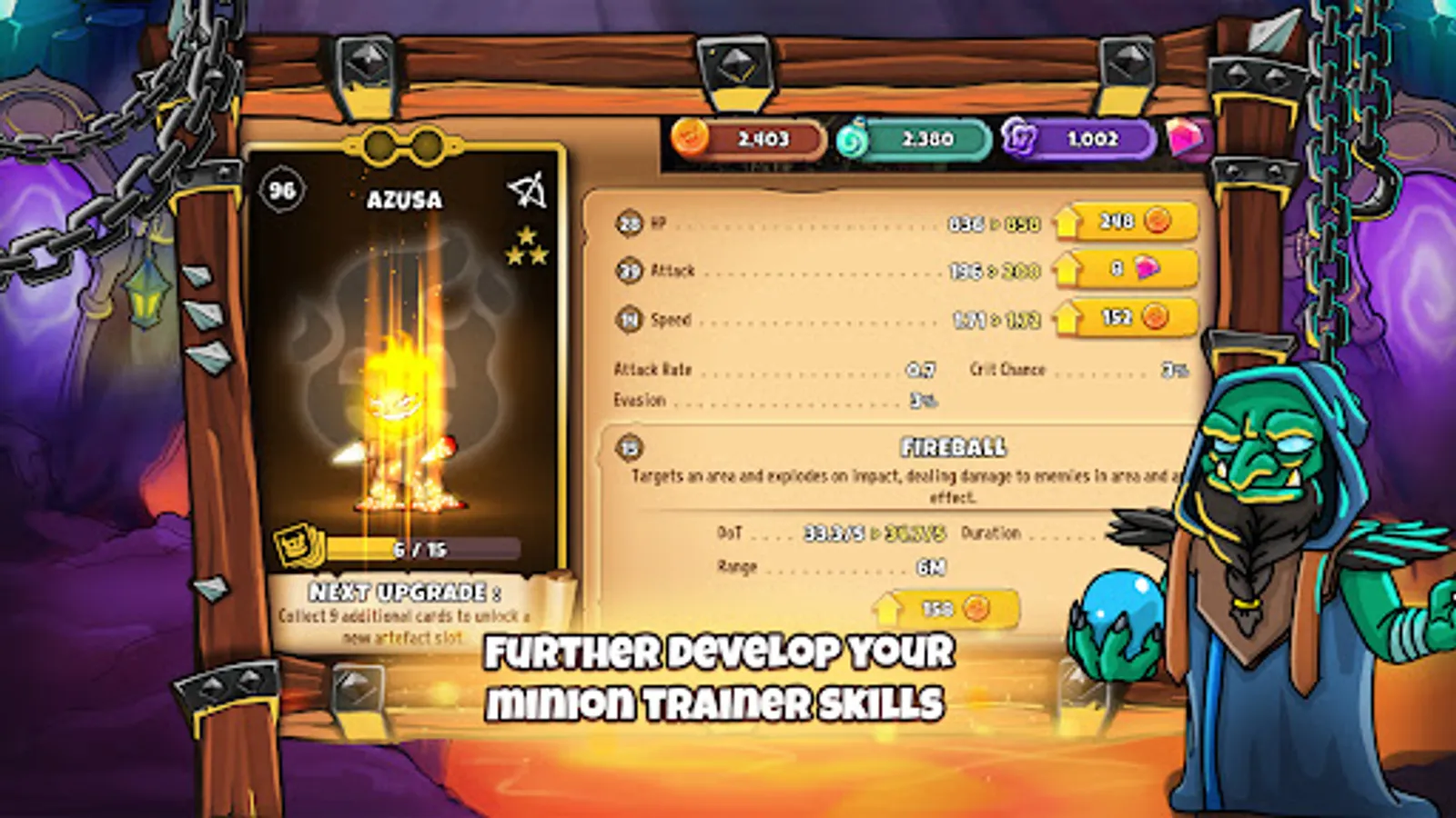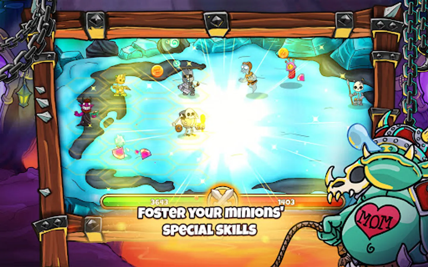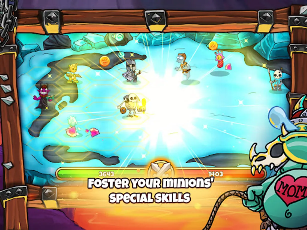 Your mission in this idle fighting game is to seize the power in the dungeon. You'll achieve this by preparing your minions well for battle. As a trainer, you should also advance your own skills. To do this, you'll use the gold you collect through victories in the arena. Idle missions in the tavern also bring you gold. You can use it to upgrade your trainer skills and those of your minions. Afterwards, you fight your way across the dungeon on a map and encounter different enemies. Use your captured resources wisely while training your minions and you'll soon be able to rule over the monsters of the underworld.