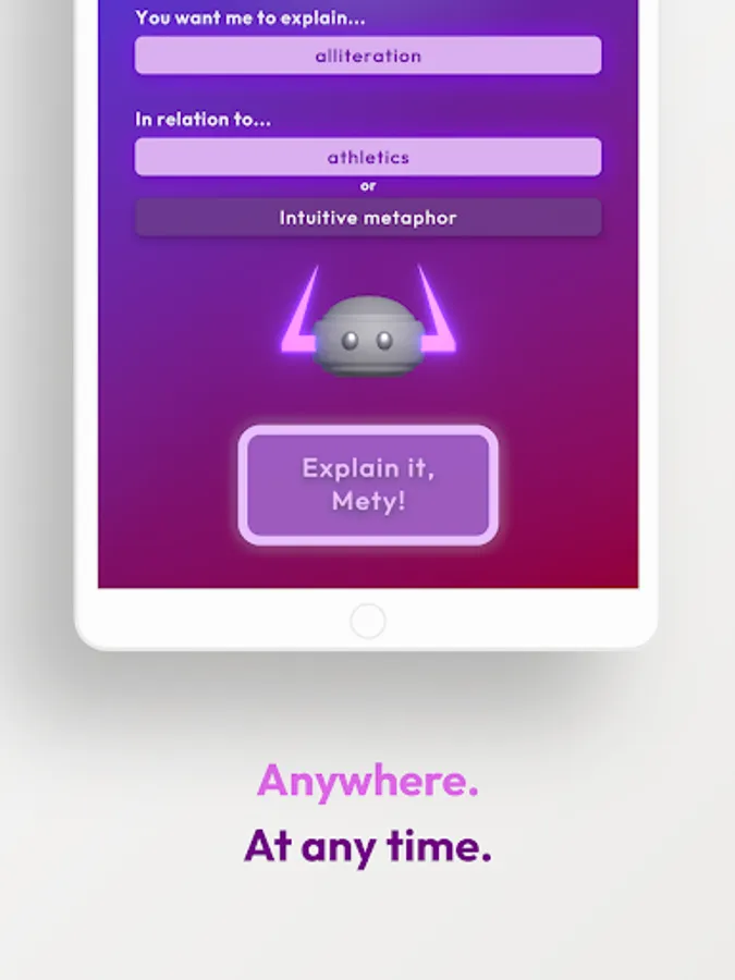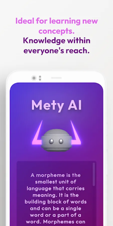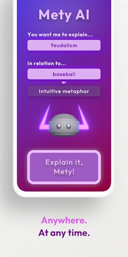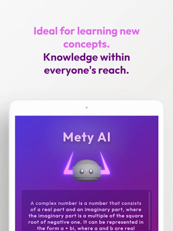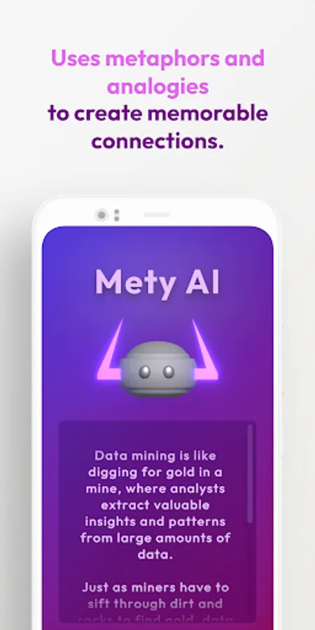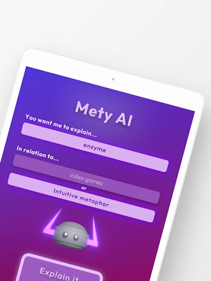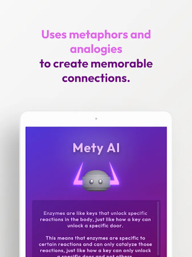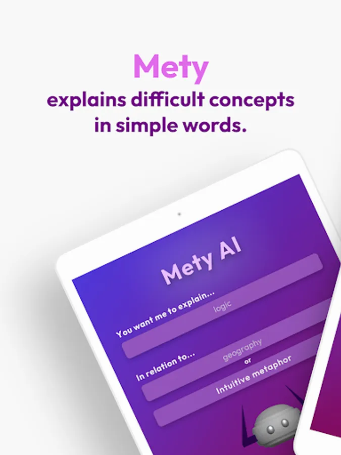 Mety AI is a mobile application that uses a cutting-edge Artificial Intelligence that employs metaphors and analogies to make learning more interesting and accessible to everyone. With its ability to explain complex concepts in an understandable way, Mety is an essential tool for students, teachers, researchers, and anyone willing to learn.