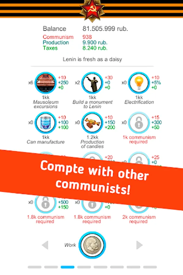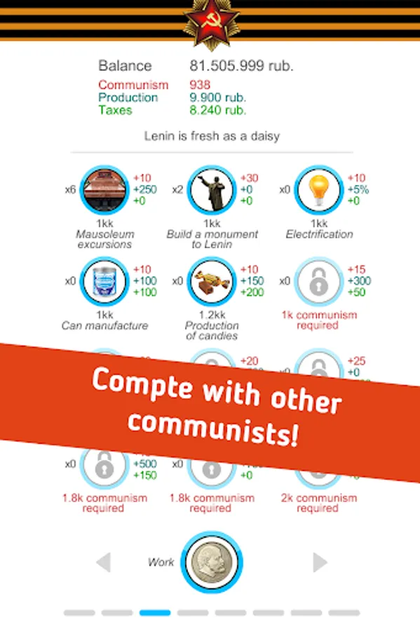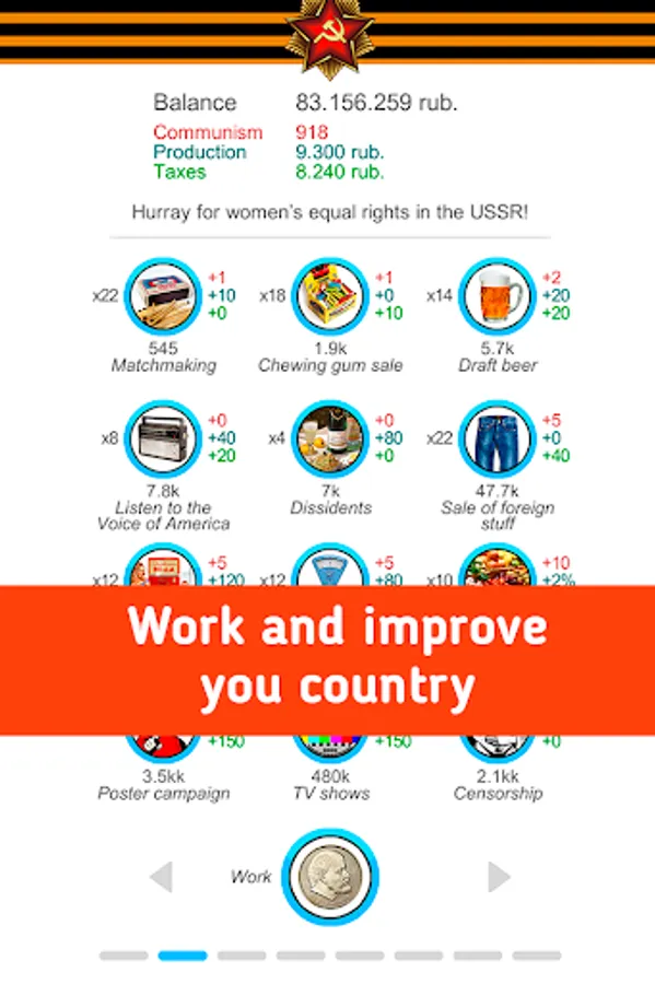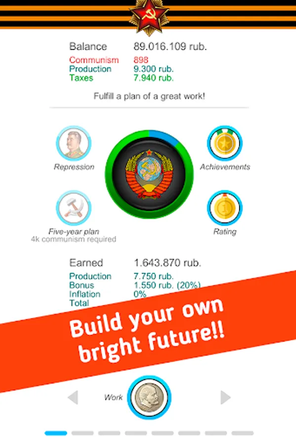 USSR Simulator - upgrade communism and build your own bright future! Imagine yourself as a Soviet official - develop your country, collect taxes, fulfill 5-year plans and fight against enemy of the people by means of repressions!