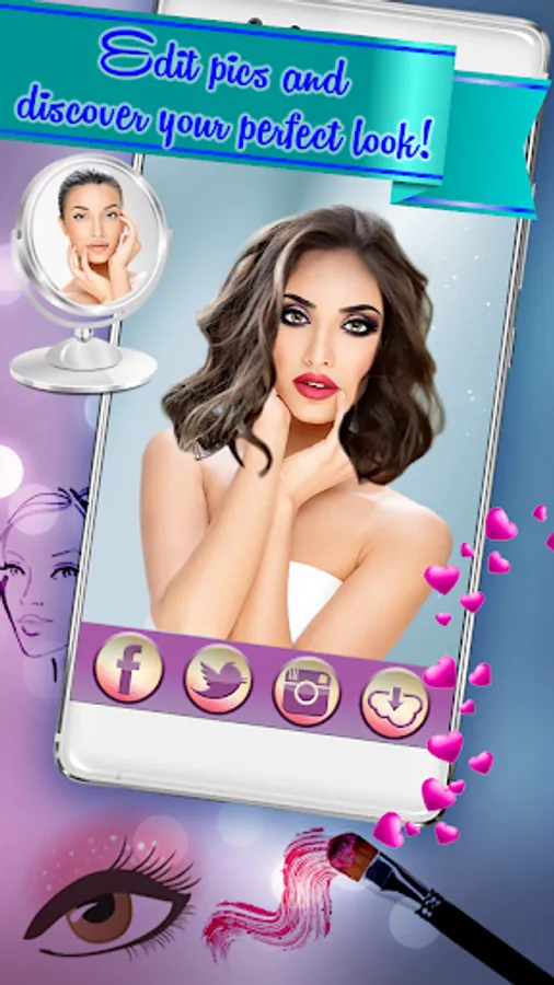 π π This pics editor will soon become your favorite one β just try it out, edit your pics and express your creativity at photo editing! Forget about all other image editing software. This photo editor Hairstyle & Makeup Beauty Salon with Photo Effects offers you so many hairstyles that it will be impossible to choose only one. Become a blonde for a day, dye your hair in the colors of rainbow, transform yourself into an attractive brunette! Your photo montage will look so realistic that it will conquer all social networks!