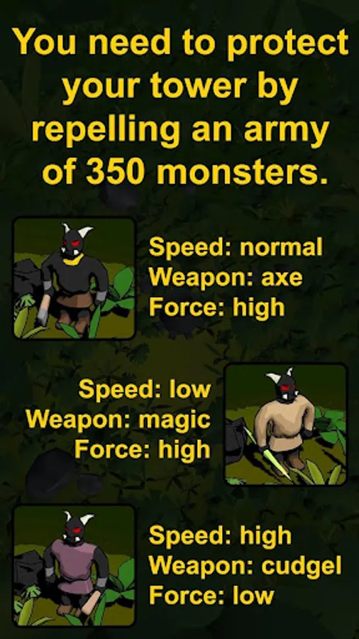 Survive this night by protecting your tower. Collect coins and upgrade tower's type. Be careful, some of the monsters have magic. The resin will slow down the monsters, and the log will flatten them.