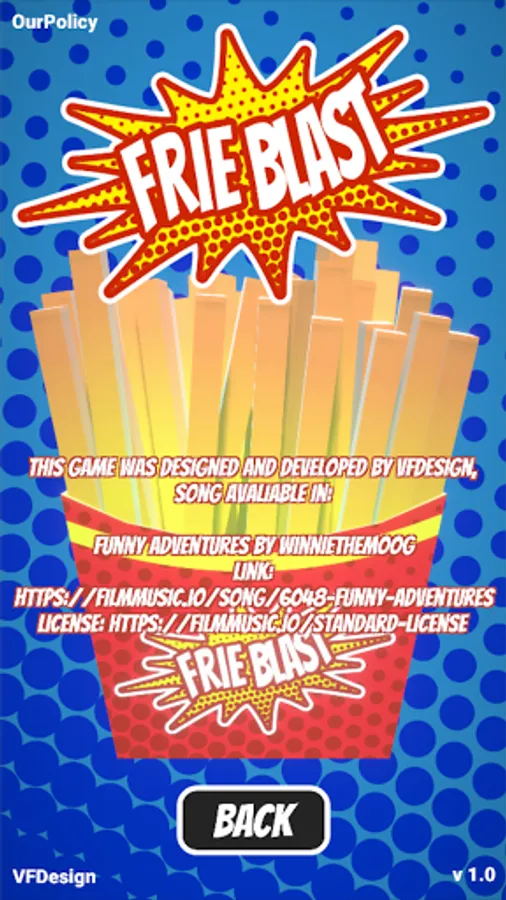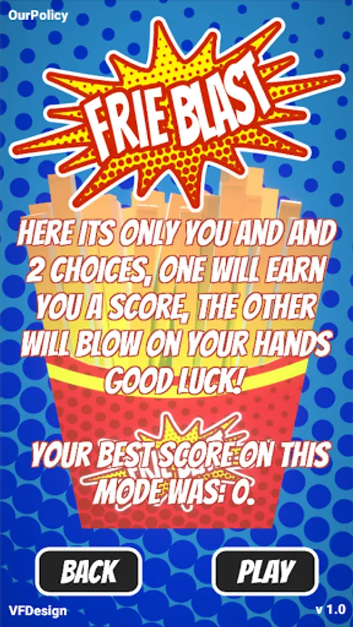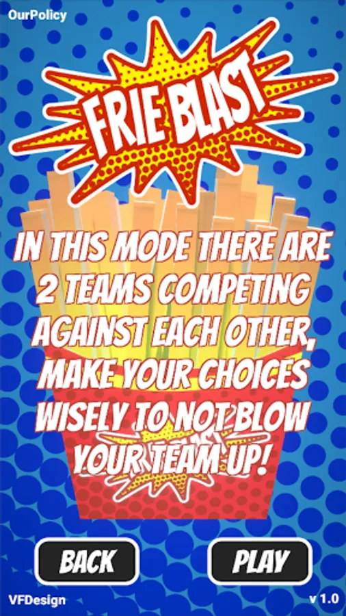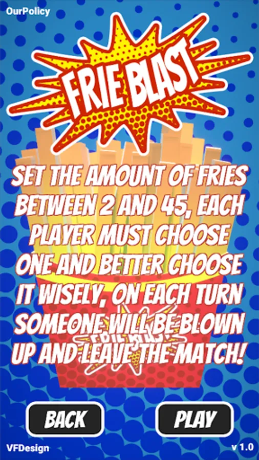 The player will have a pack of french fries, one of them is explosive the objective is to empty the entire pack without getting the explosive one, the game also have 3 different modes to challenge the player alone or a bunch of friends.