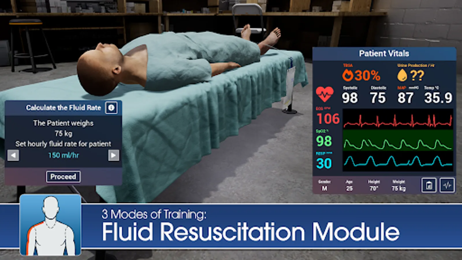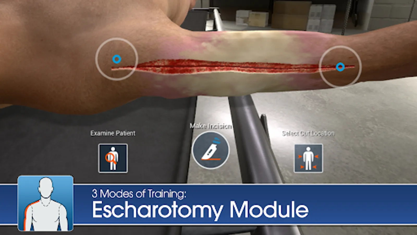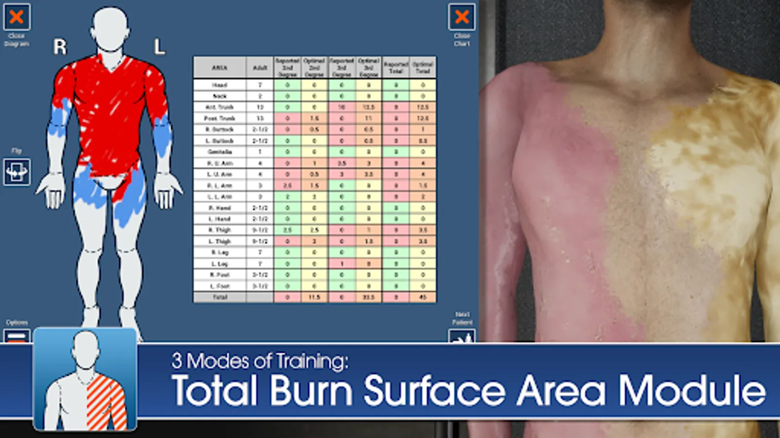 In this app, the user examines and treats randomized nude adult patients; randomization enables variable practice and repetition, subsequently improving burn care knowledge transfer to the real world.