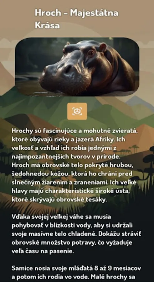 This application is an addition to the beautiful existing park in Štiavnick Aves Park. You can see a lot of animals there, and the ones you can't find there can be viewed with the help of a mobile phone in augmented reality anywhere, either directly on the spot or in the comfort of your home. Do not hesitate to please all the animals in Aves Park with your visit :)