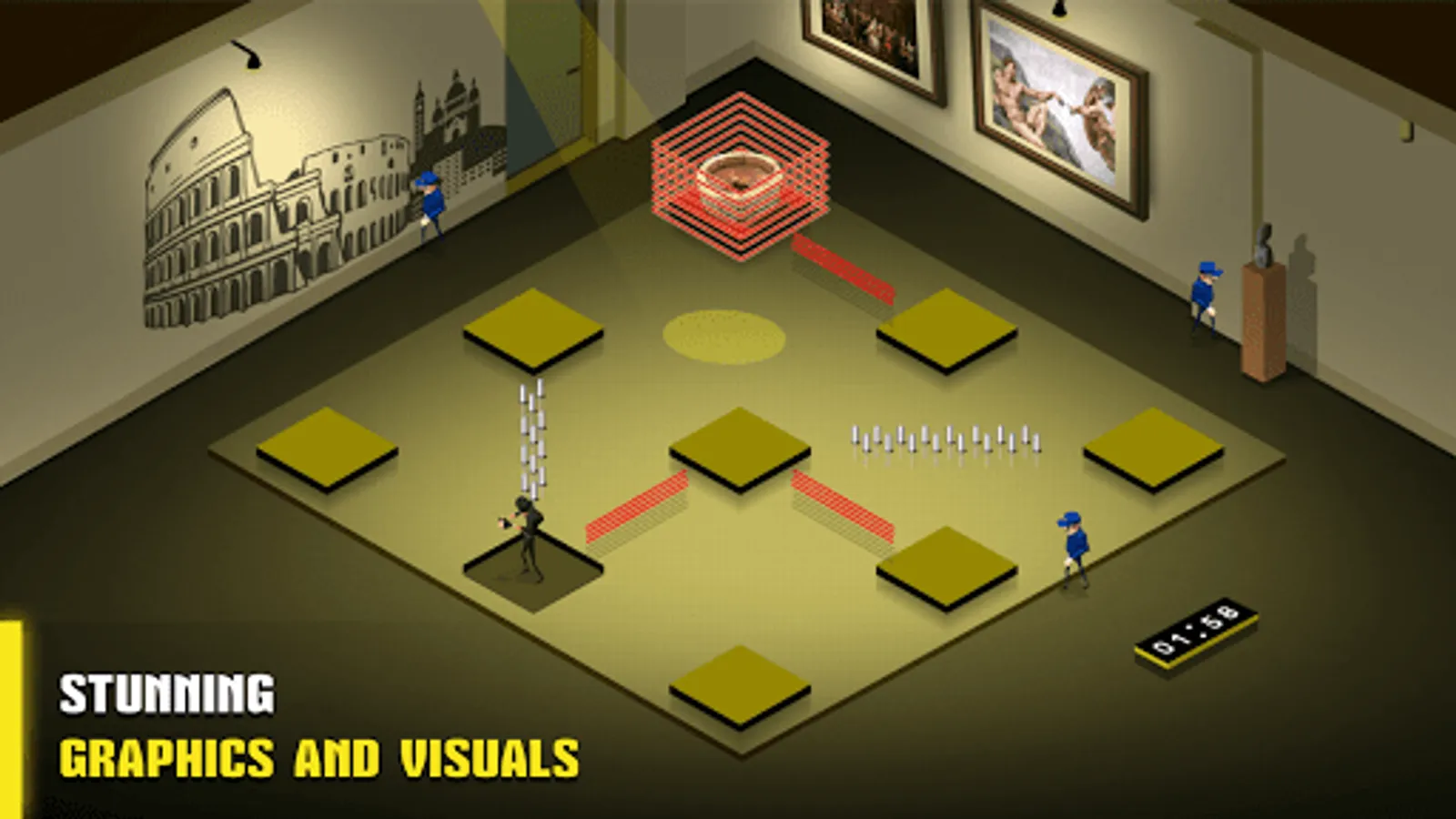 Welcome to A Thief's Journey . A simple puzzle game which is set in a relaxed environment of a museum room filled with guards , searchlights , spikes and lasers against a backdrop of soothing calm music where all you have to do is tip toe around the floor and find your way to steal the prize. Relaxing isn't it ??