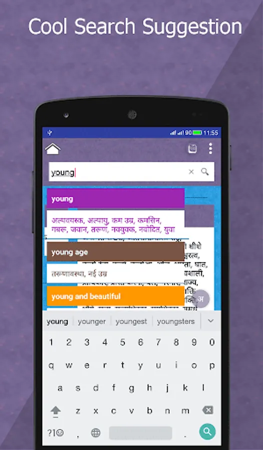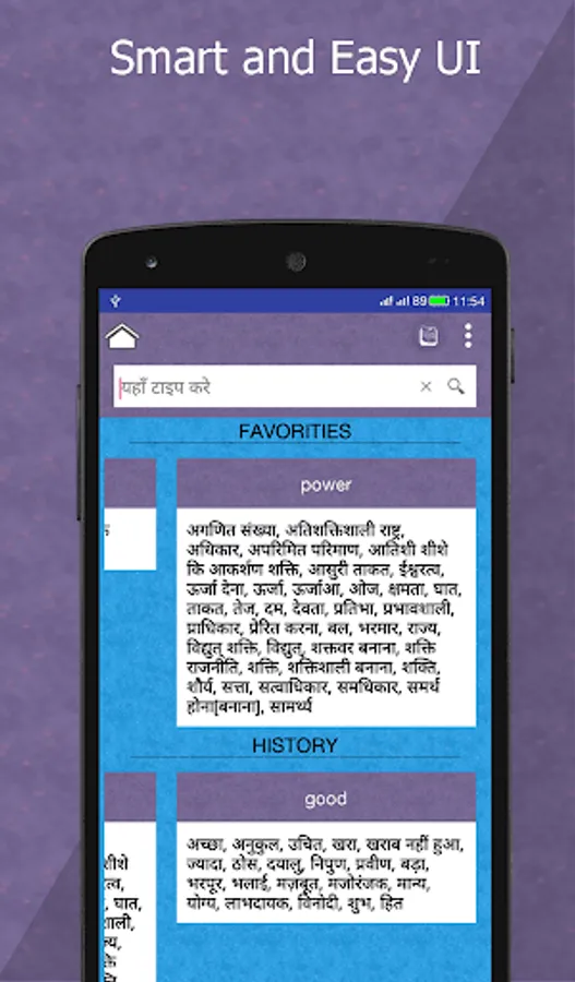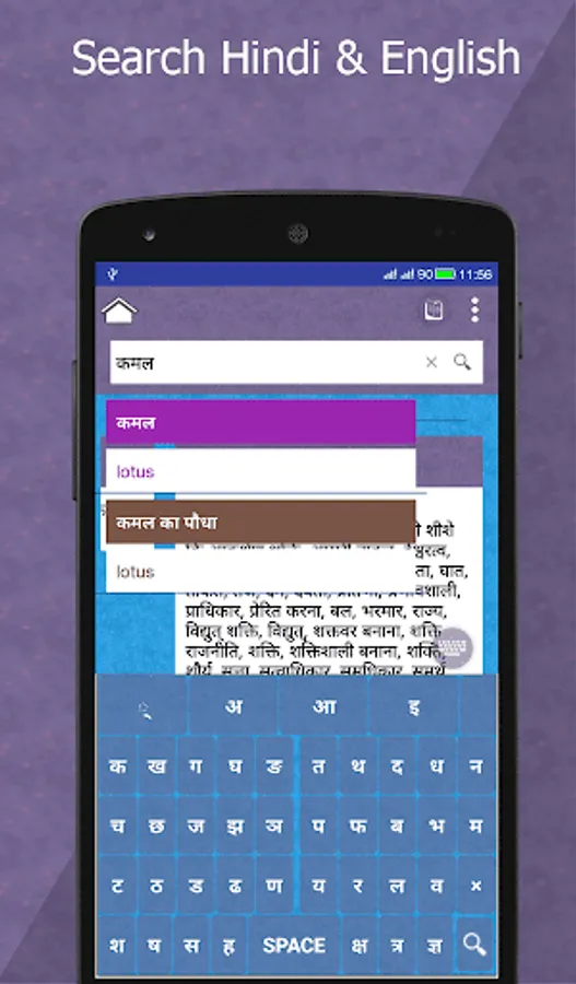 This English Hindi Dictionary app is very simple to use. This app provide you whole details of English word in Hindi and English. In this English Hindi Dictionary app you can find words with an auto-complete suggestion list, in suggestion list every word have results. This Dictionary app provide you facility to save your word in favorite. In This Dictionary you can learn every day new word and every word of the day's words are saved in previous days words history by this you can see word again.