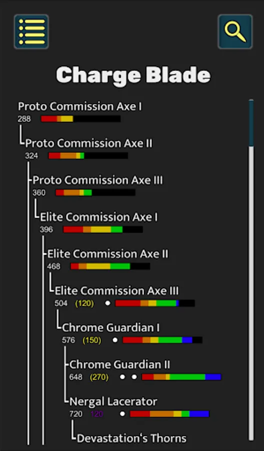 - Weapon trees with each weapon's stats and required materials