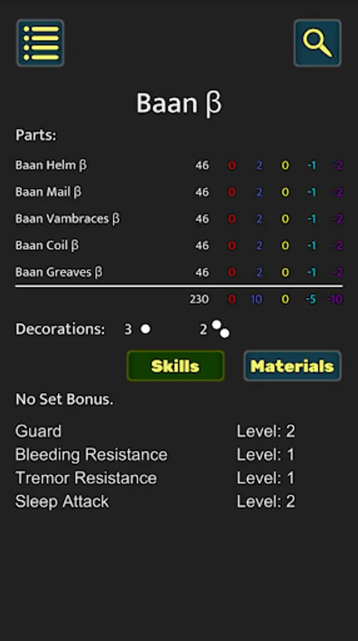 - Armor list of all sets and pieces along with their respective skills