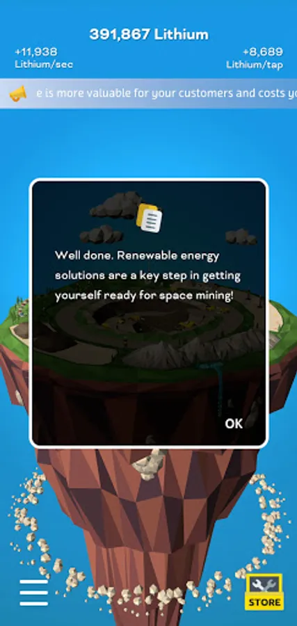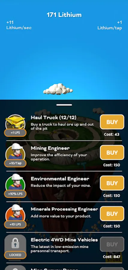 Become the boss of MineTech Island, a floating Lithium deposit ready for you to mine. As you extract Lithium you can use it to buy equipment, upgrade your technology, and employ specialist engineers. Making purchases will increase the productivity of your operation, by extracting Lithium autonomously and improving your personal mining efficiency. Progressing through the store will help you learn about cutting-edge innovations in the mining industry that are enabling more sustainable mining operations. Throughout the journey you will have the opportunity to invest in research with UNSW to improve technologies and partner with NASA to begin your space mining career. The goal is to gain enough experience, technology and resources to launch your own colony rocket to Mars. See who can get there the fastest!