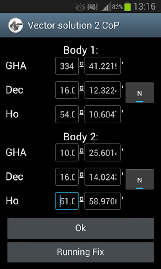 Take the Nautical Almanac and find the coordinates of the celestial bodies: GHA, declination.
