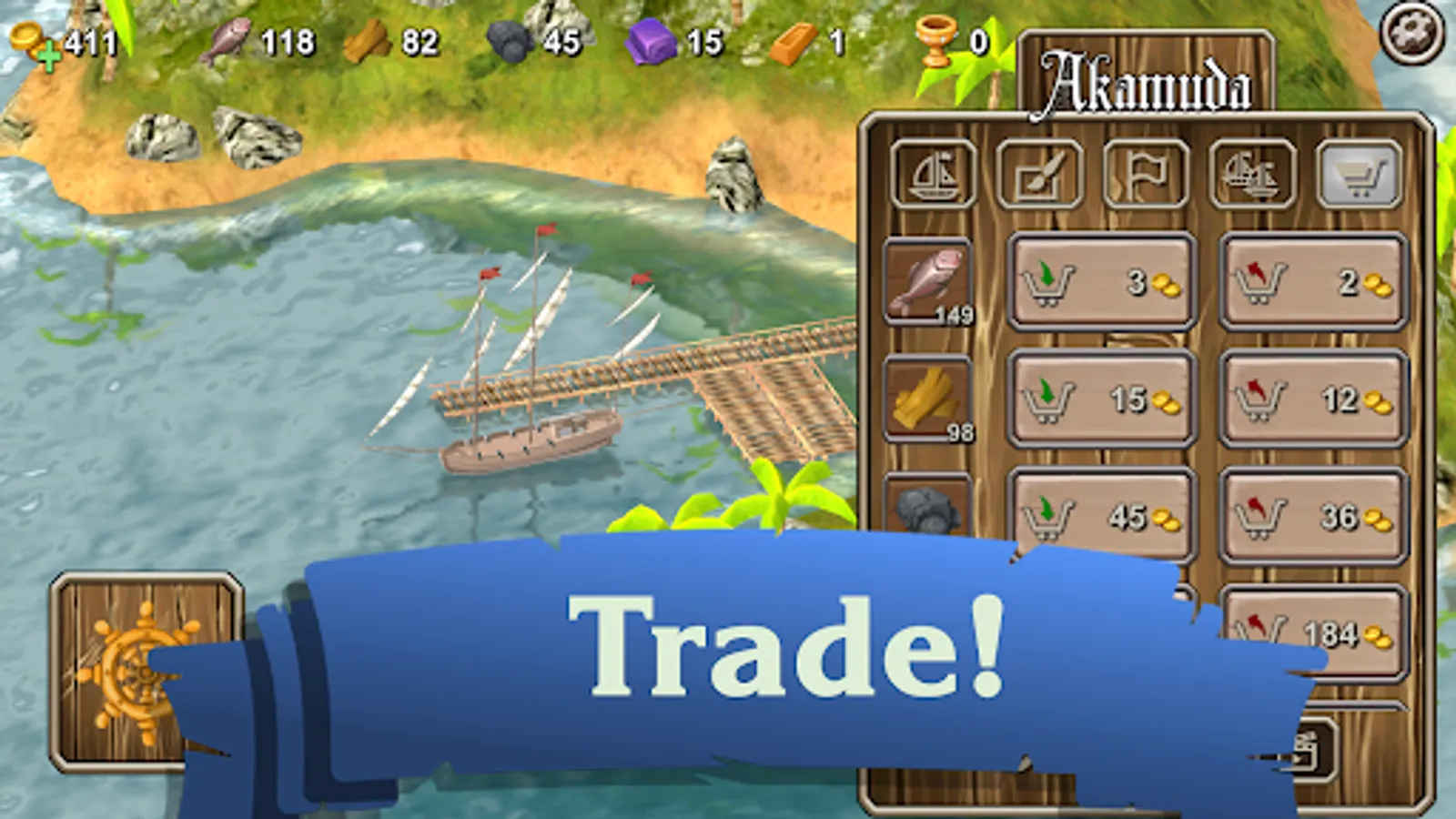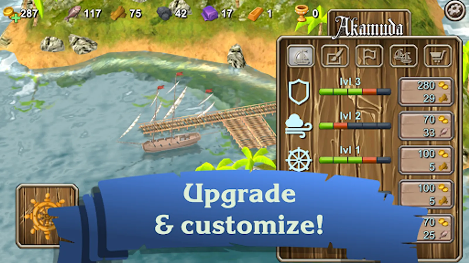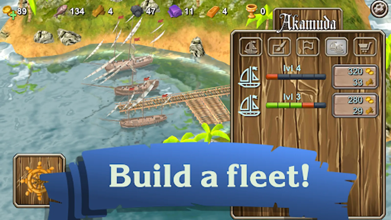 Start with a small boat and upgrade it to a powerful sailing ship with lots of cannons. Fish, explore and trade, get the resources you need to upgrade your ship.