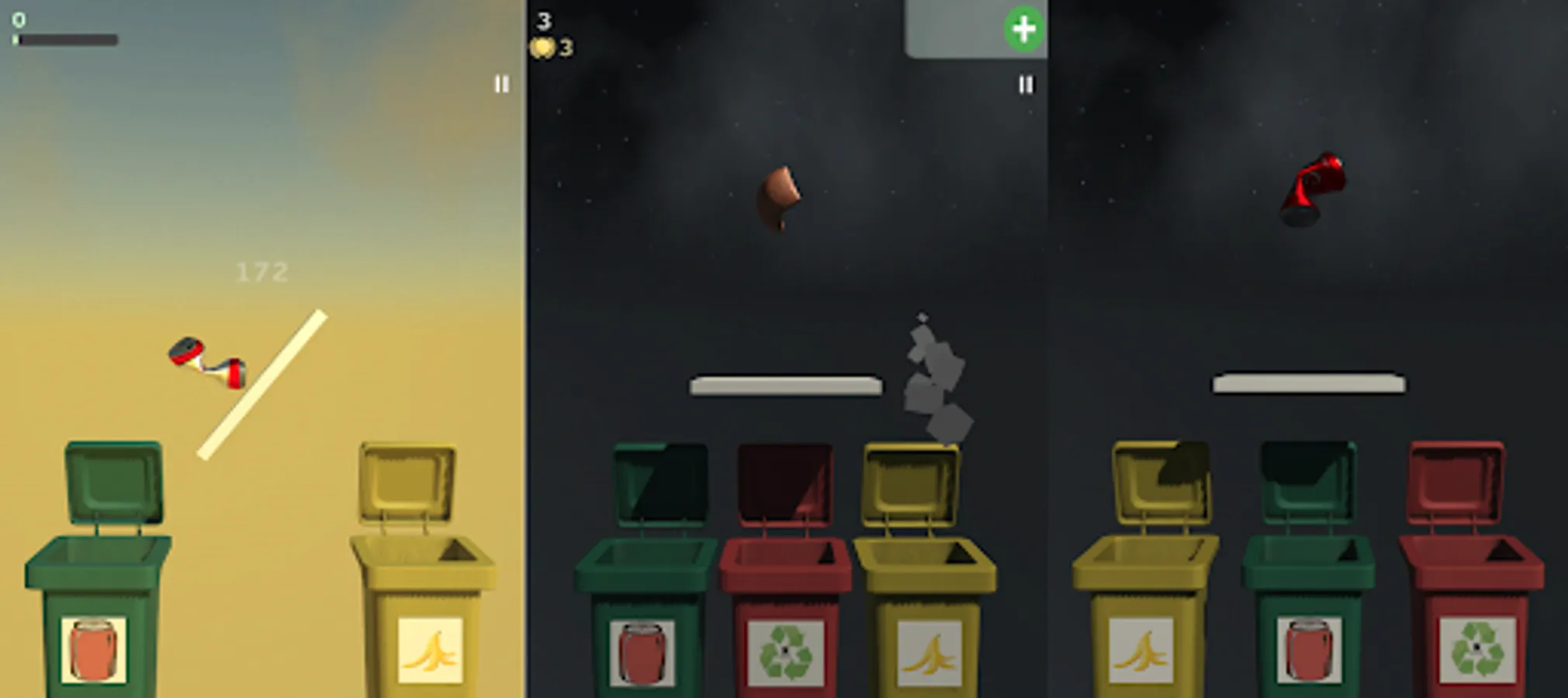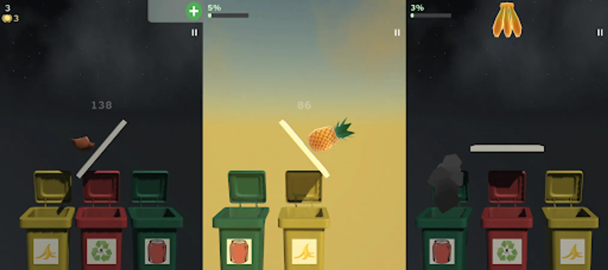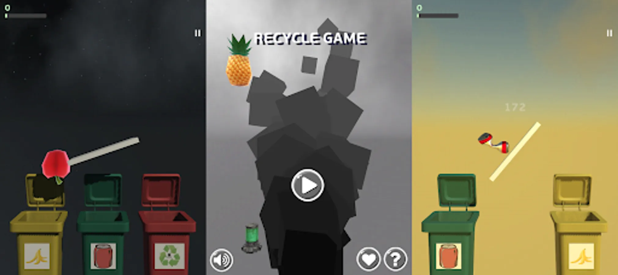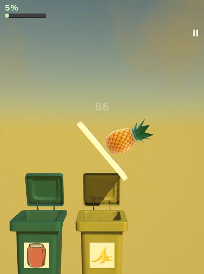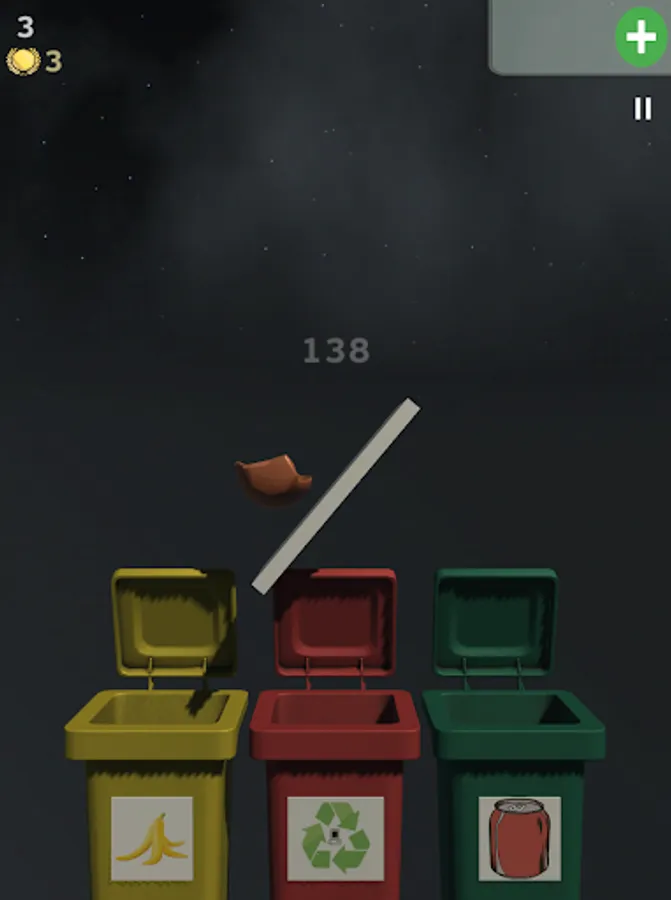 Choose which one of the given bins is the proper for recyclable trash, cans or spoiled food. But be careful, you have limited time until platform will fall down. So try to recycle rubbish as fast as possible and be careful, because bins always get shuffled. Also game has 2 available modes: levels and endless mode. In endless mode you have 3 tries, but on each level any mistake will lead to lose. And game gets harder from level to level. Good luck!