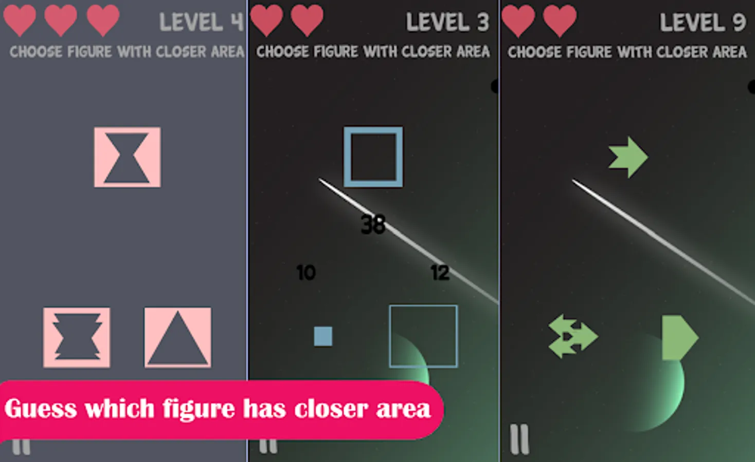 Choose geometry figure with closer area. Levels with different complexity - a lot of complex and interesting objects. Guess the size of figure. Different beautiful themes and great interface.