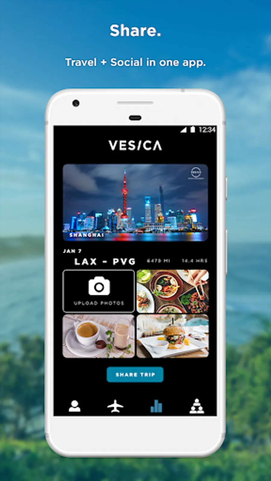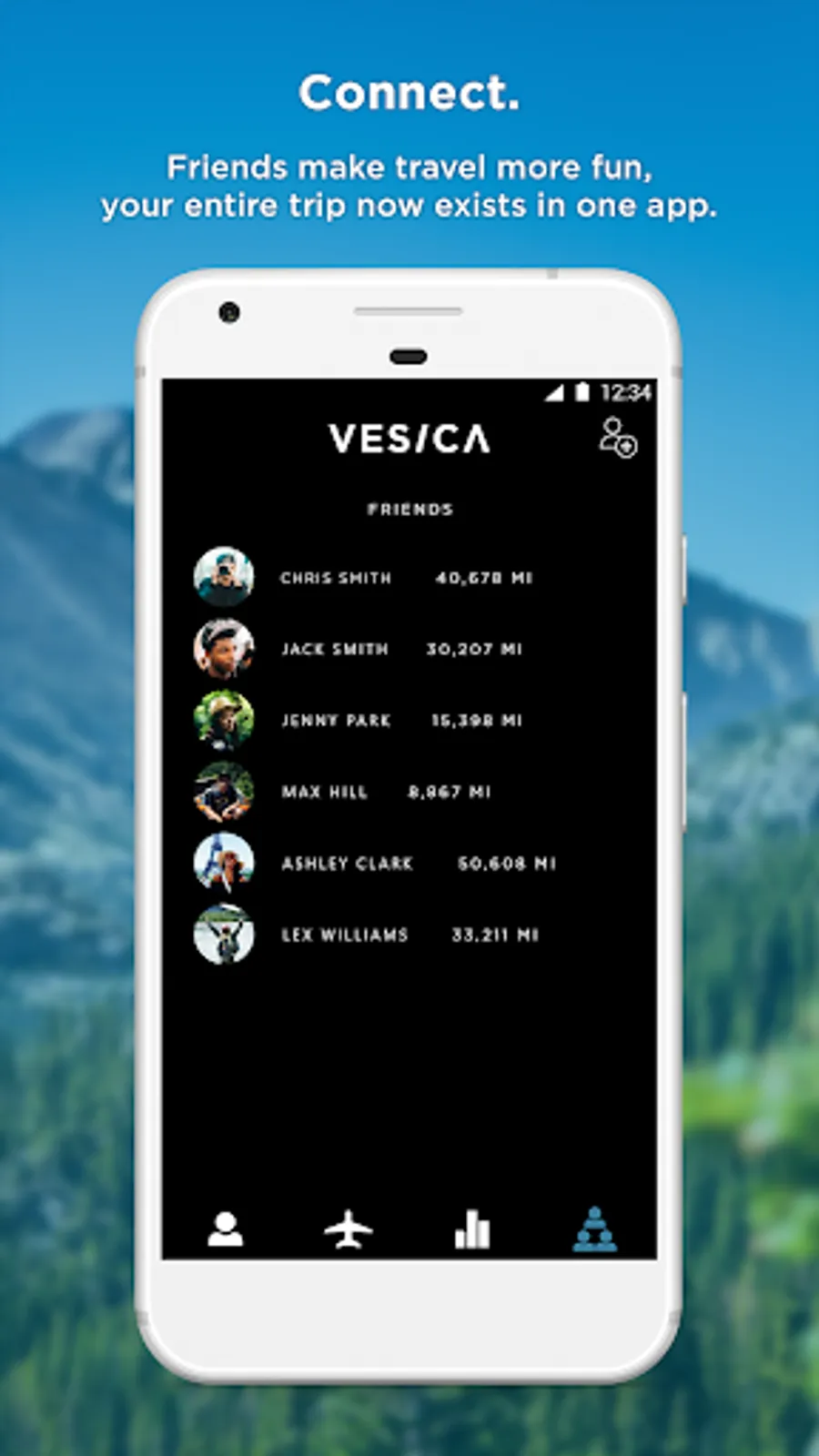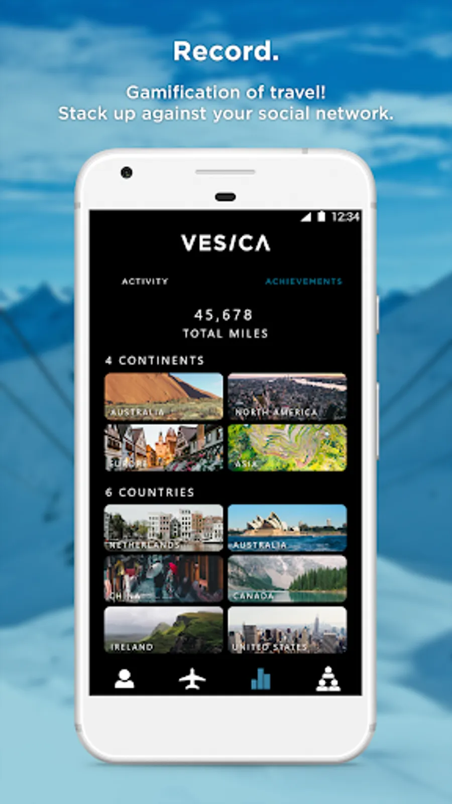 Let VESICA track your treks. Log miles traveled, time in air, and destinations visited. Then see