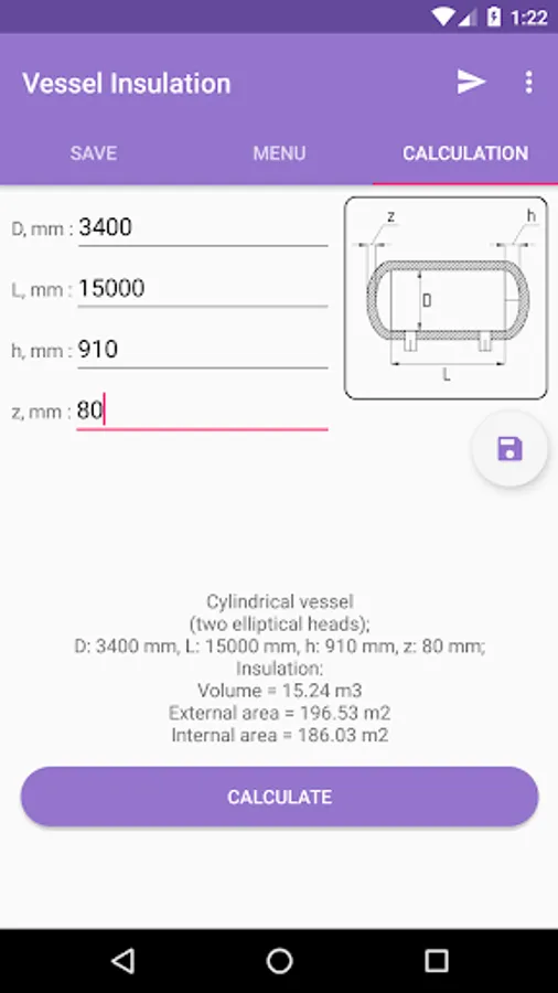 With this mobile application you can easily determine the volume of insulation needed to cover the surface of a vessel or pipeline. Also, the calculation of the external and internal area insulation.