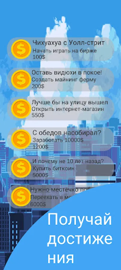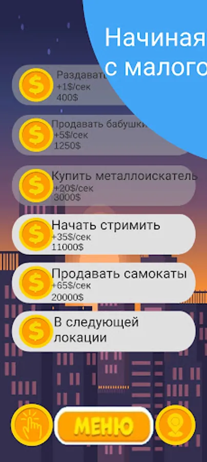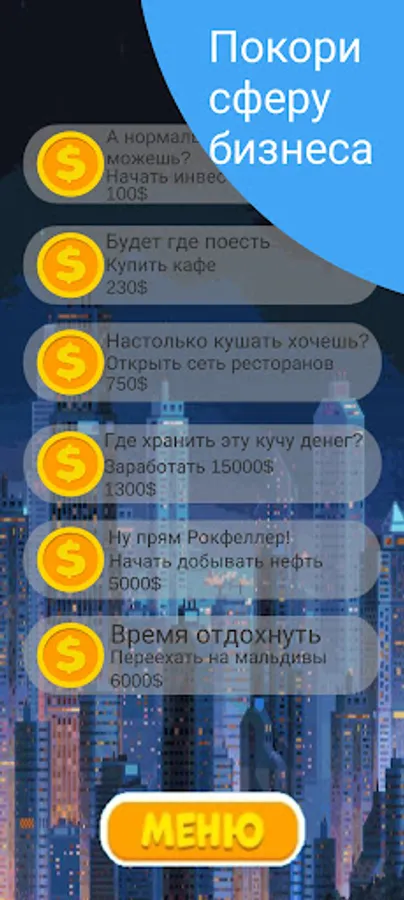 In this exciting game you have to become the richest man in the world. With your business ideas, you can conquer the whole world, starting from your small town, you will eventually get to Mars! By clicking on the button, buying passive upgrades and upgrades on the click, taking achievements, you will achieve your cherished goal.